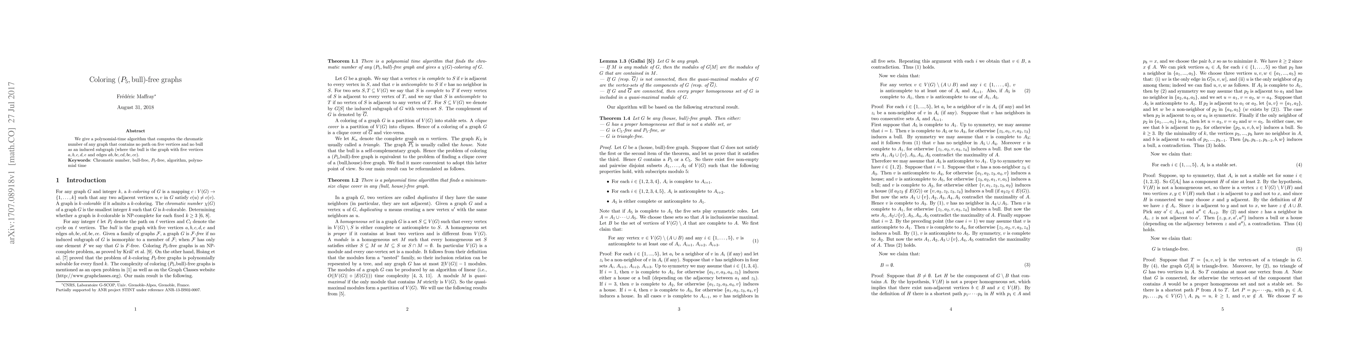 Summary: A polynomial-time algorithm is presented to determine the chromatic number of graphs that do not contain a path of five vertices or a bull as induced subgraphs. This addresses a specific class of graph coloring problems.