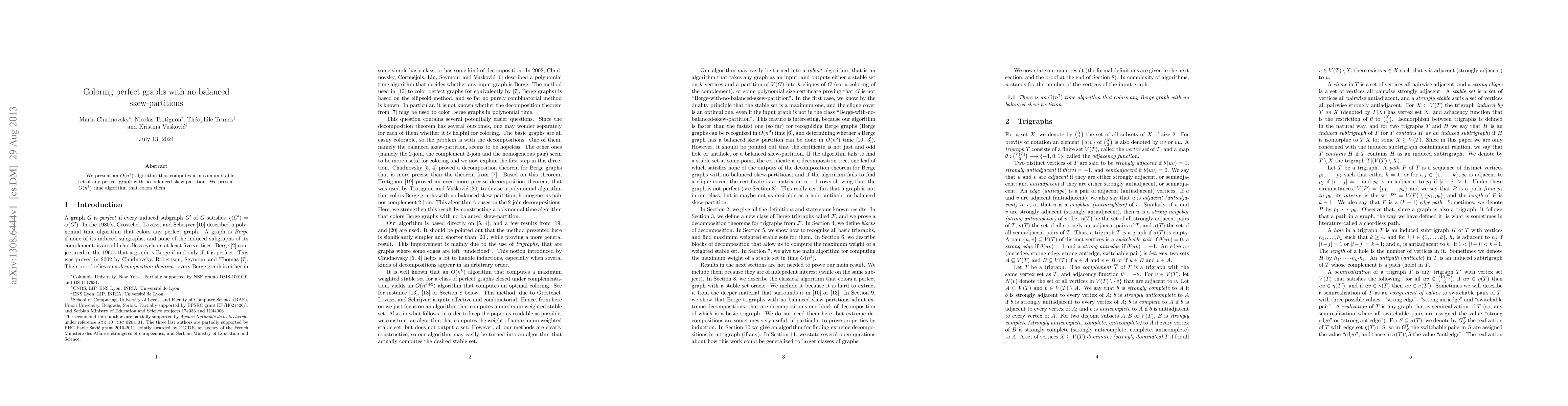 A new algorithm has been developed to color and find stable sets in perfect graphs without balanced skew-partitions, with improved time complexity of O(n^7) for coloring and O(n^5) for finding maximum stable sets.