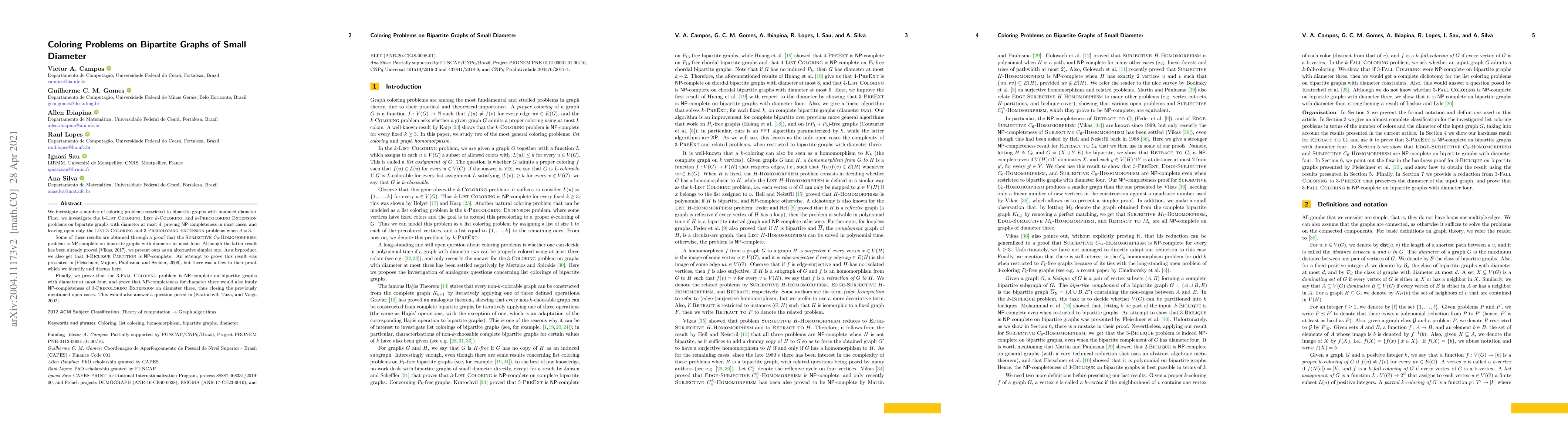 This paper explores various coloring problems on bipartite graphs with small diameter, proving NP-completeness for several, including $k$-List Coloring and $k$-Precoloring Extension, except for List $3$-Coloring and $3$-Precoloring Extension when the diameter is three. It also shows the NP-completeness of $3$-Biclique Partition and $3$-Fall Coloring on such graphs.