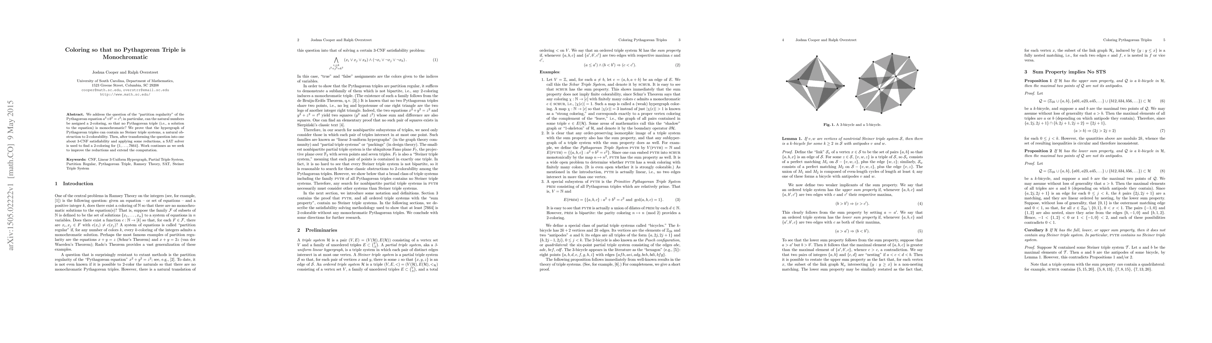 This paper explores whether the natural numbers can be 2-colored such that no Pythagorean triple (a solution to a^2+b^2=c^2) is monochromatic. The authors prove that the absence of Steiner triple systems in the hypergraph of Pythagorean triples obstructs 2-colorability and use SAT solvers to find a valid 2-coloring for numbers up to 7664, with ongoing efforts to improve computational methods.