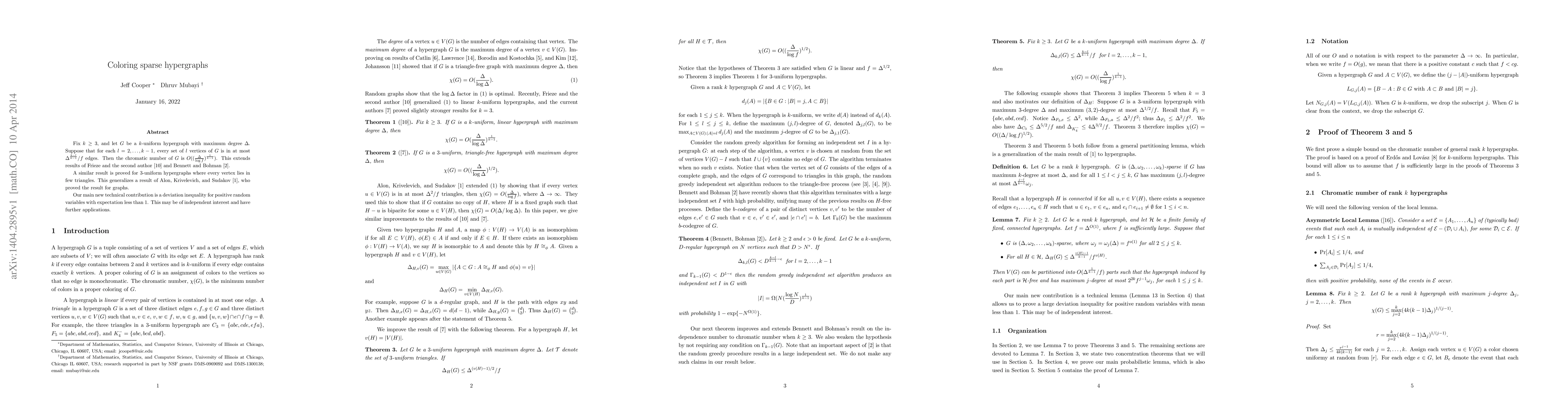 Fix $k \geq 3$, and let $G$ be a $k$-uniform hypergraph with maximum degree $\Delta$. Suppose that for each $l = 2, ..., k-1$, every set of l vertices of G is in at most $\Delta^{(k-l)/(k-1)}/f$ edges. Then the chromatic number of $G$ is $O( (\Delta/\log f)^{1/(k-1)})$. This extends results of Frieze and the second author and Bennett and Bohman. A similar result is proved for 3-uniform hypergraphs where every vertex lies in few triangles. This generalizes a result of Alon, Krivelevich, and Sudakov, who proved the result for graphs. Our main new technical contribution is a deviation inequality for positive random variables with expectation less than 1. This may be of independent interest and have further applications.