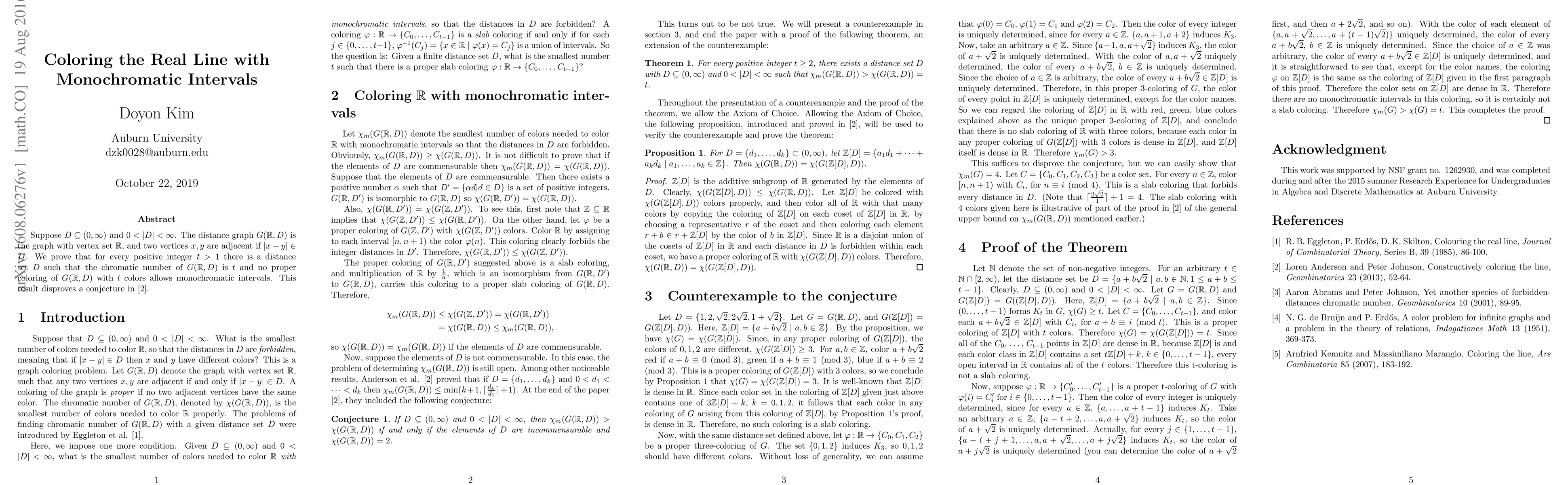 Let D be a finite set of positive real numbers. The distance graph G(R,D) is the graph with vertex set R (set of real numbers), and two vertices x, y are adjacent if |x-y| belongs to D. We prove that every positive integer t>1 there is a distance set D such that the chromatic number of G(R,D) is t and no proper coloring of G(R,D) with t colors allows monochromatic intervals. This result disproves a conjecture in [2].