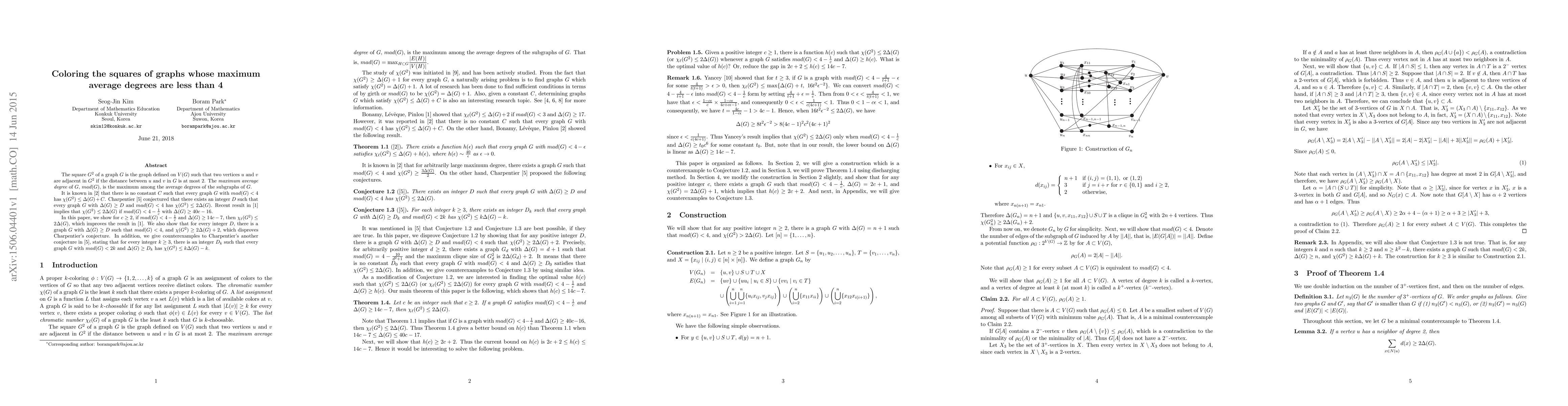 This research paper improves a previous result on the chromatic number of square graphs with maximum average degrees less than 4, disproving Charpentier's conjecture and providing counterexamples.