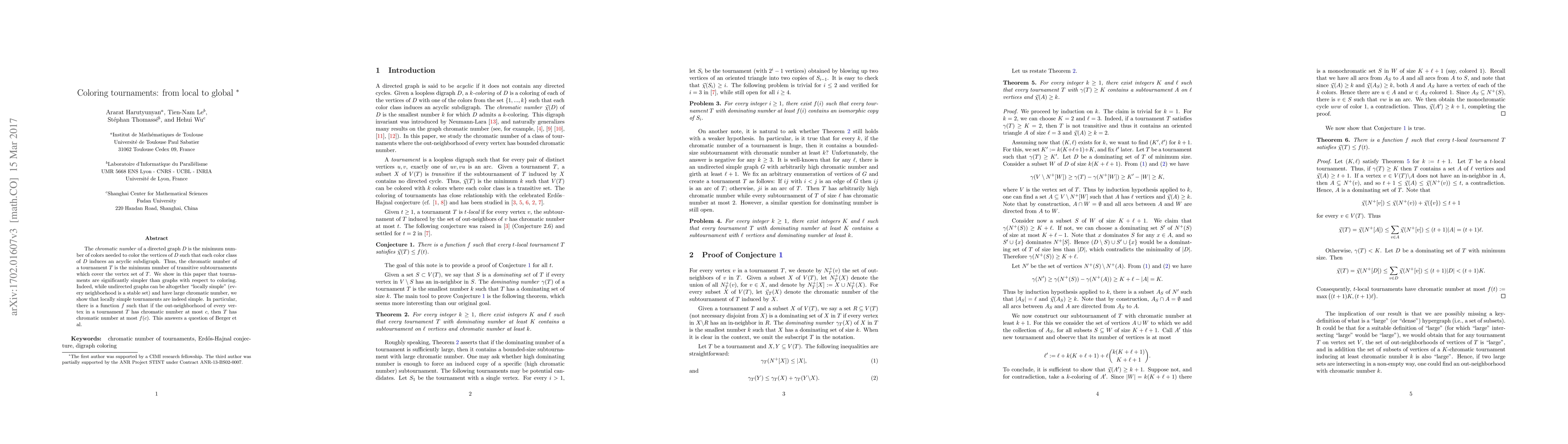 This paper demonstrates that tournaments are simpler than general directed graphs in terms of coloring. It establishes a function $f$ that bounds the chromatic number of a tournament based on the chromatic number of its local neighborhoods, resolving a question posed by Berger et al.