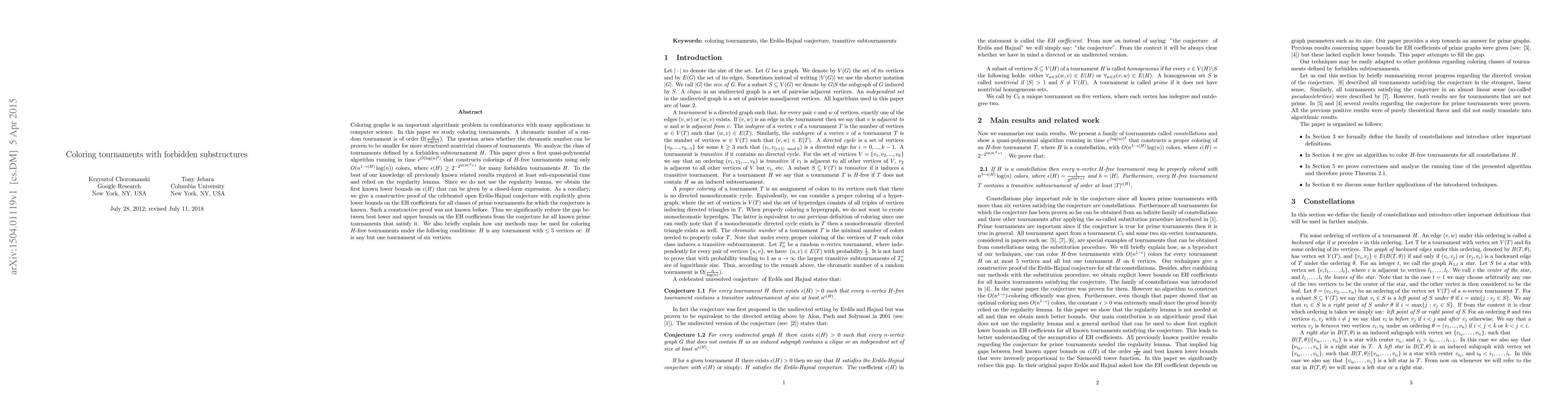 This paper presents a quasi-polynomial time algorithm for coloring tournaments that avoid specific forbidden substructures, using significantly fewer colors than previously possible. It provides constructive proofs for the Erdős-Hajnal conjecture for prime tournaments, reducing the gap between lower and upper bounds on the EH coefficients.