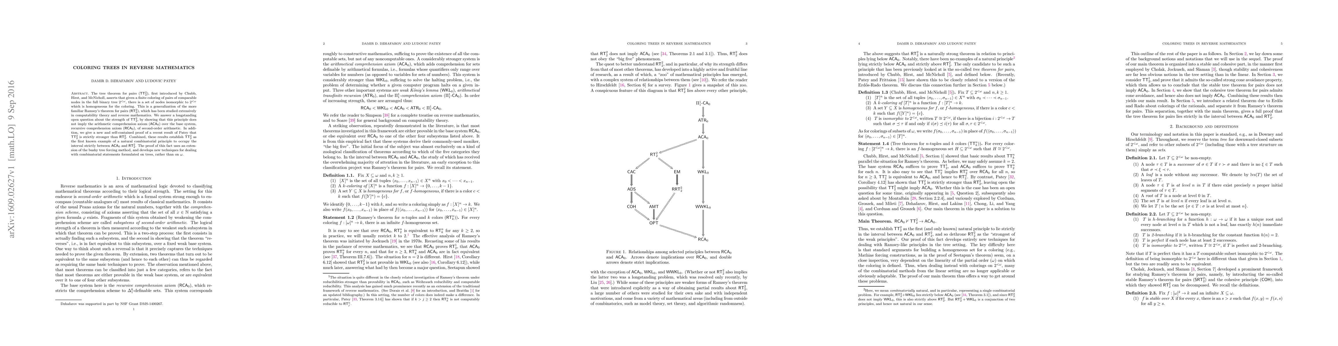 The tree theorem for pairs ($\mathsf{TT}^2_2$), first introduced by Chubb, Hirst, and McNicholl, asserts that given a finite coloring of pairs of comparable nodes in the full binary tree $2^{<\omega}$, there is a set of nodes isomorphic to $2^{<\omega}$ which is homogeneous for the coloring. This is a generalization of the more familiar Ramsey's theorem for pairs ($\mathsf{RT}^2_2$), which has been studied extensively in computability theory and reverse mathematics. We answer a longstanding open question about the strength of $\mathsf{TT}^2_2$, by showing that this principle does not imply the arithmetic comprehension axiom ($\mathsf{ACA}_0$) over the base system, recursive comprehension axiom ($\mathsf{RCA}_0$), of second-order arithmetic. In addition, we give a new and self-contained proof of a recent result of Patey that $\mathsf{TT}^2_2$ is strictly stronger than $\mathsf{RT}^2_2$. Combined, these results establish $\mathsf{TT}^2_2$ as the first known example of a natural combinatorial principle to occupy the interval strictly between $\mathsf{ACA}_0$ and $\mathsf{RT}^2_2$. The proof of this fact uses an extension of the bushy tree forcing method, and develops new techniques for dealing with combinatorial statements formulated on trees, rather than on $\omega$.