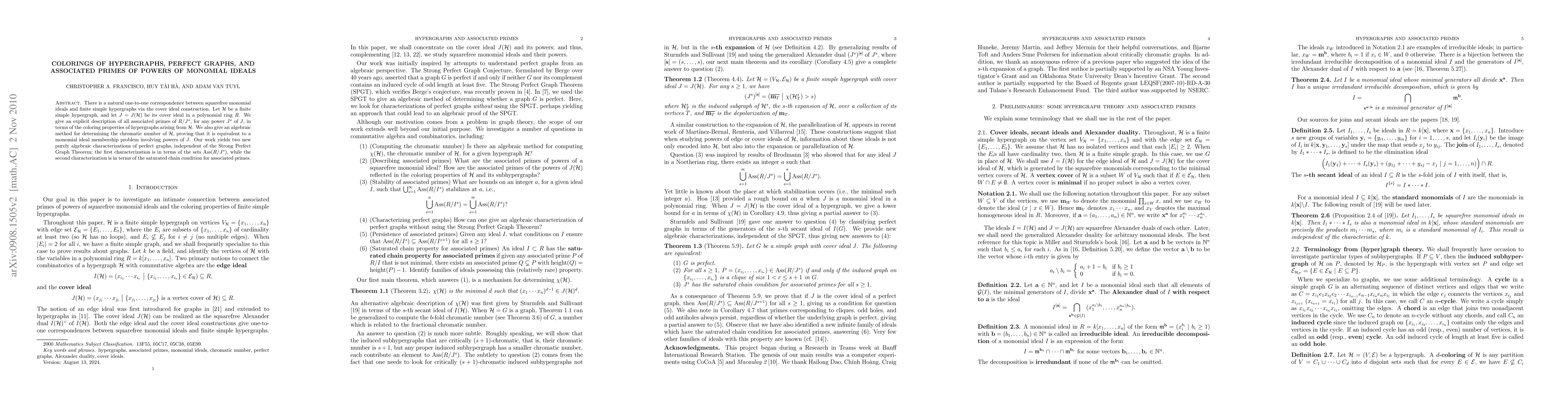 This paper establishes a correspondence between squarefree monomial ideals and hypergraphs, linking their associated primes to hypergraph coloring properties. It also provides algebraic methods to determine hypergraph chromatic numbers and introduces new algebraic characterizations of perfect graphs independent of the Strong Perfect Graph Theorem.