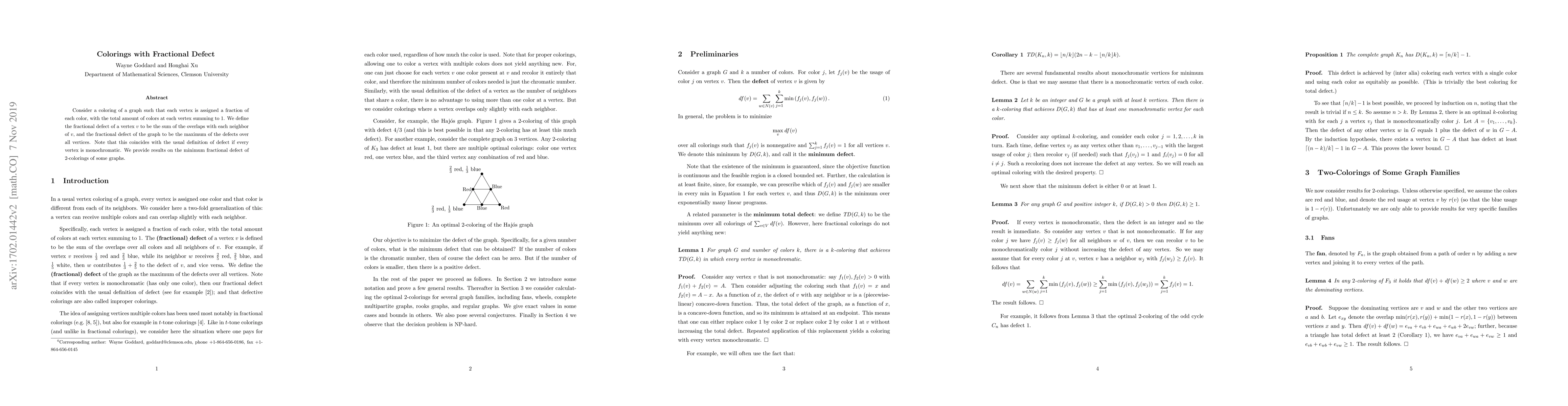 Consider a coloring of a graph such that each vertex is assigned a fraction of each color, with the total amount of colors at each vertex summing to $1$. We define the fractional defect of a vertex $v$ to be the sum of the overlaps with each neighbor of $v$, and the fractional defect of the graph to be the maximum of the defects over all vertices. Note that this coincides with the usual definition of defect if every vertex is monochromatic. We provide results on the minimum fractional defect of $2$-colorings of some graphs.