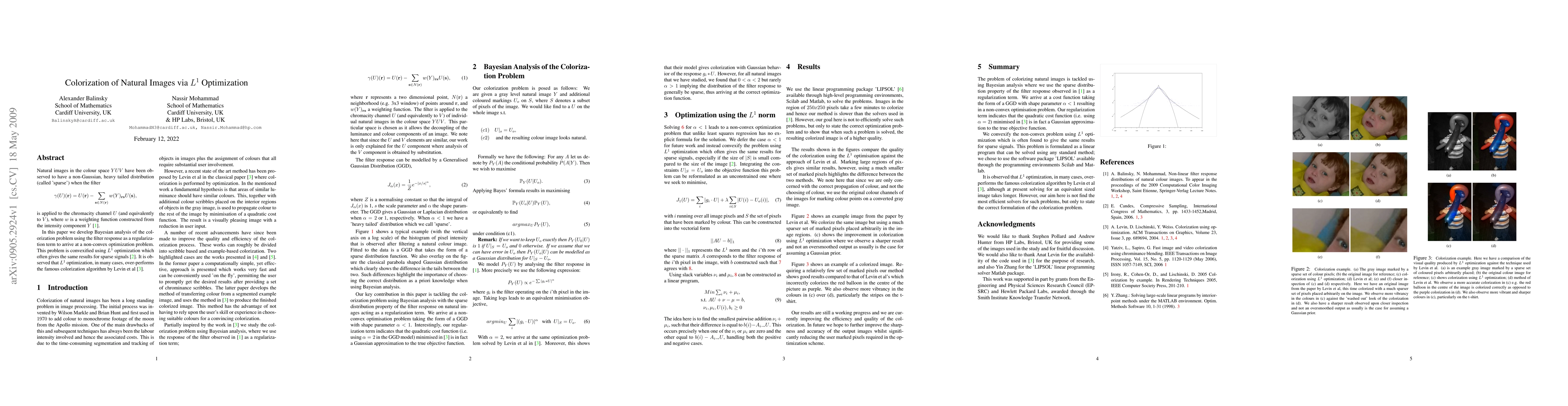 This paper uses L1 optimization to solve a colorization problem in natural images, outperforming a previously known algorithm in many cases. It achieves this through Bayesian analysis and filter response regularization.
