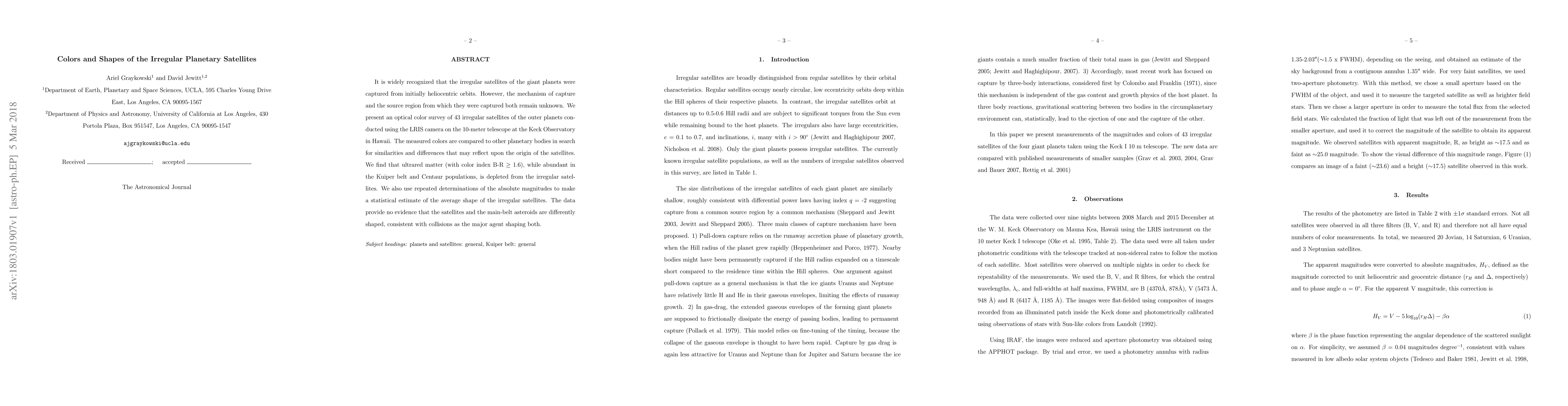 This study conducts an optical color survey of 43 irregular planetary satellites using the LRIS camera at the Keck Observatory, finding that these satellites lack ultrared matter common in the Kuiper belt and Centaurs. It also estimates the average shape of these satellites, concluding they are similarly shaped to main-belt asteroids, suggesting collisions as a primary shaping force.
