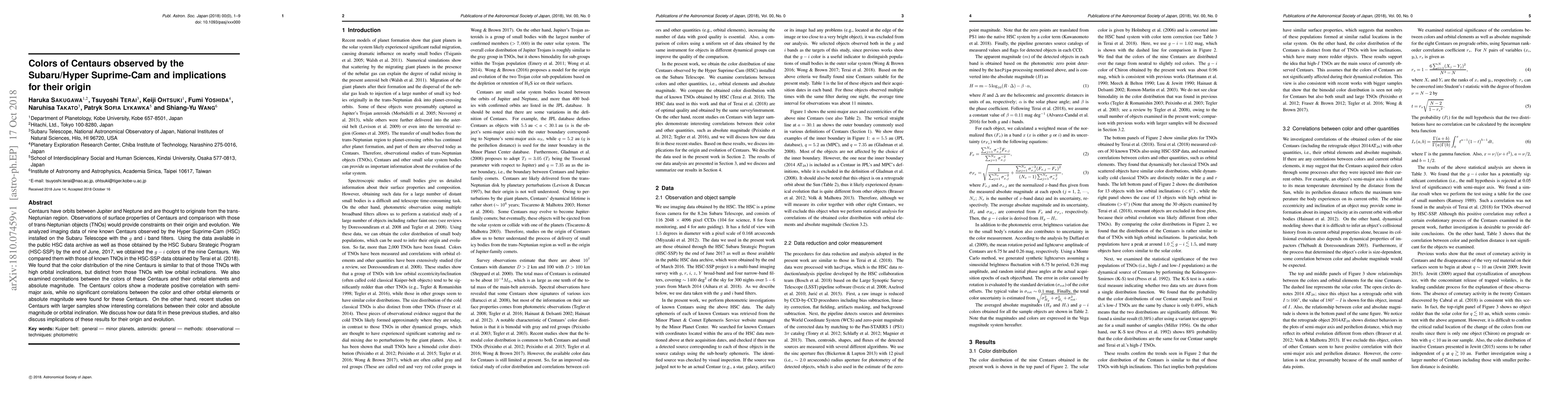 This study analyzes the g-i colors of nine Centaurs observed using the Subaru/Hyper Suprime-Cam, finding that their color distribution aligns with TNOs of high orbital inclinations, suggesting a shared origin. The Centaurs' colors moderately correlate with their semi-major axis, providing insights into their origin and evolution.