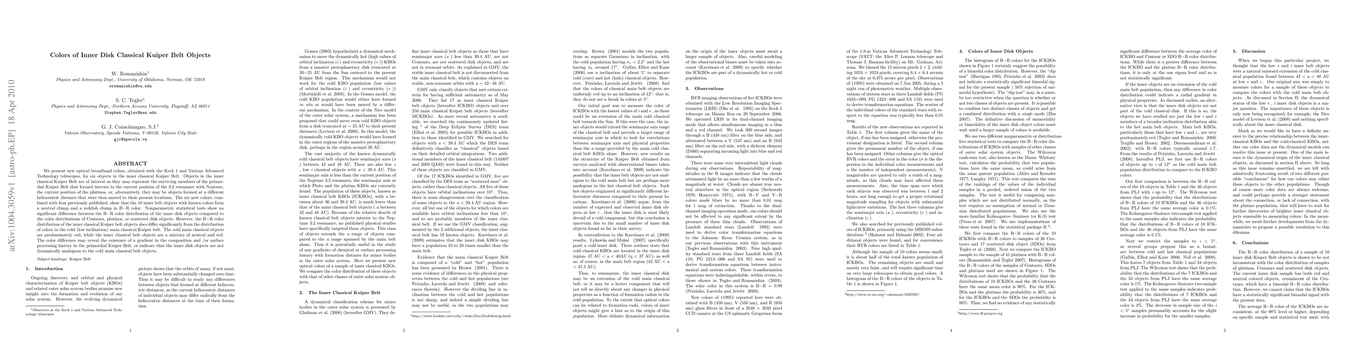 The research presents new optical broadband colors for six inner classical Kuiper Belt Objects (ICKBOs) using the Keck 1 and Vatican Advanced Technology telescopes, combined with previously published colors for a total of ten objects. These colors were derived by comparing with Landolt standard stars to obtain color transformation equations to the Johnson-Kron-Cousins system.