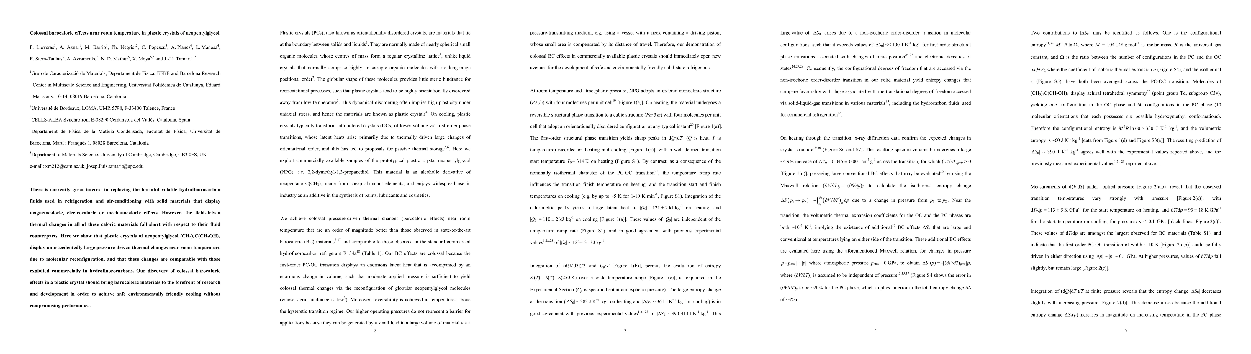 This paper reports on the discovery of significant barocaloric effects in plastic crystals of neopentylglycol, revealing large pressure-driven thermal changes near room temperature. This finding positions plastic crystals as promising candidates for environmentally friendly refrigeration technologies, potentially rivaling the performance of harmful hydrofluorocarbon fluids.