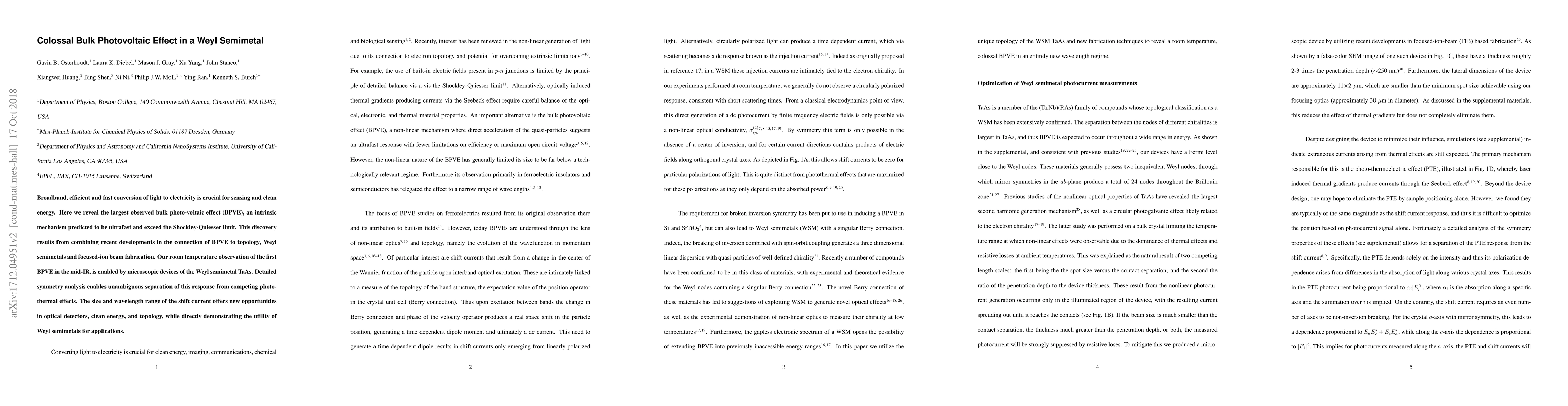 Broadband, efficient and fast conversion of light to electricity is crucial for sensing and clean energy. Here we reveal the largest observed bulk photo-voltaic effect (BPVE), an intrinsic mechanism predicted to be ultrafast and exceed the Shockley-Quiesser limit. This discovery results from combining recent developments in the connection of BPVE to topology, Weyl semimetals and focused-ion beam fabrication. Our room temperature observation of the first BPVE in the mid-IR, is enabled by microscopic devices of the Weyl semimetal TaAs. Detailed symmetry analysis enables unambiguous separation of this response from competing photo-thermal effects. The size and wavelength range of the shift current offers new opportunities in optical detectors, clean energy, and topology, while directly demonstrating the utility of Weyl semimetals for applications.