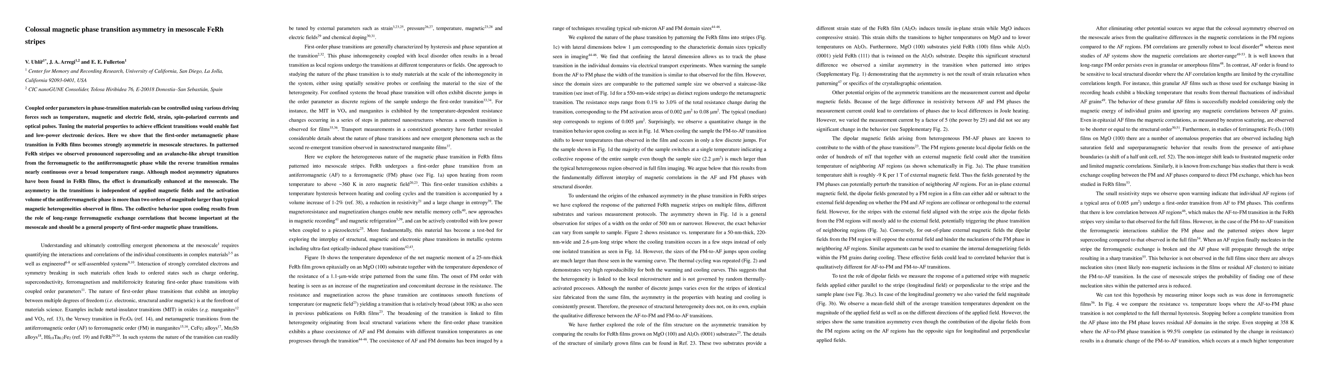 This study reveals a significant asymmetry in the magnetic phase transition of mesoscale FeRh stripes, showing pronounced supercooling and an abrupt transition from ferromagnetic to antiferromagnetic phases, while the reverse transition is nearly continuous. This asymmetry, driven by long-range ferromagnetic exchange correlations, is independent of magnetic fields and suggests a general property of first-order magnetic phase transitions.