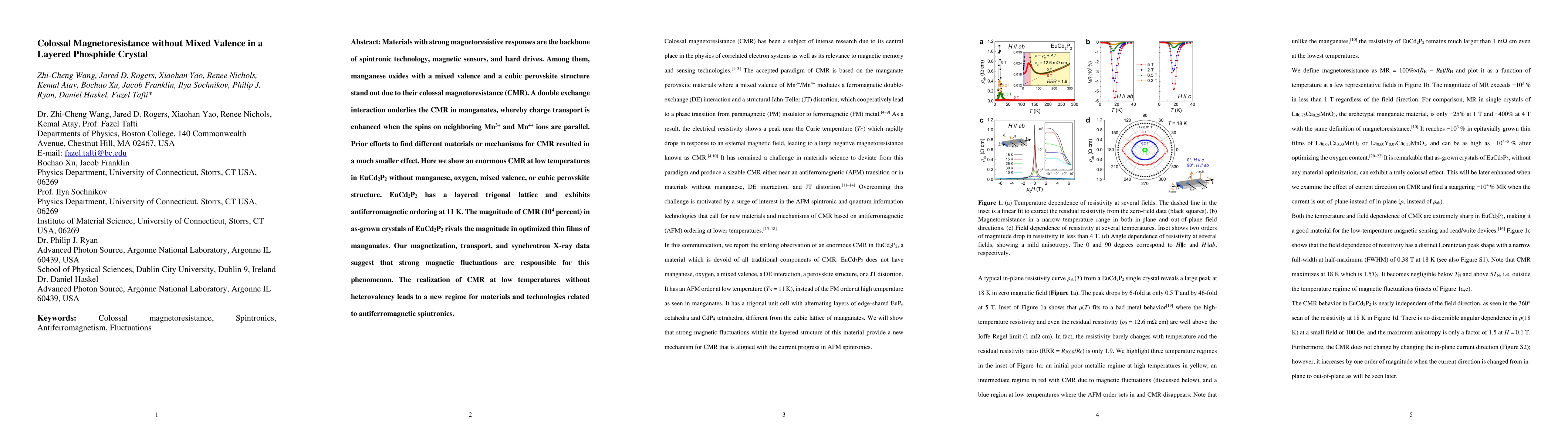 This paper reports colossal magnetoresistance (CMR) in EuCd2P2, a layered phosphide crystal without mixed valence, rivaling the CMR in manganese oxides. The study suggests that strong magnetic fluctuations, rather than double exchange interactions, are responsible for the observed CMR, opening new avenues for antiferromagnetic spintronics.