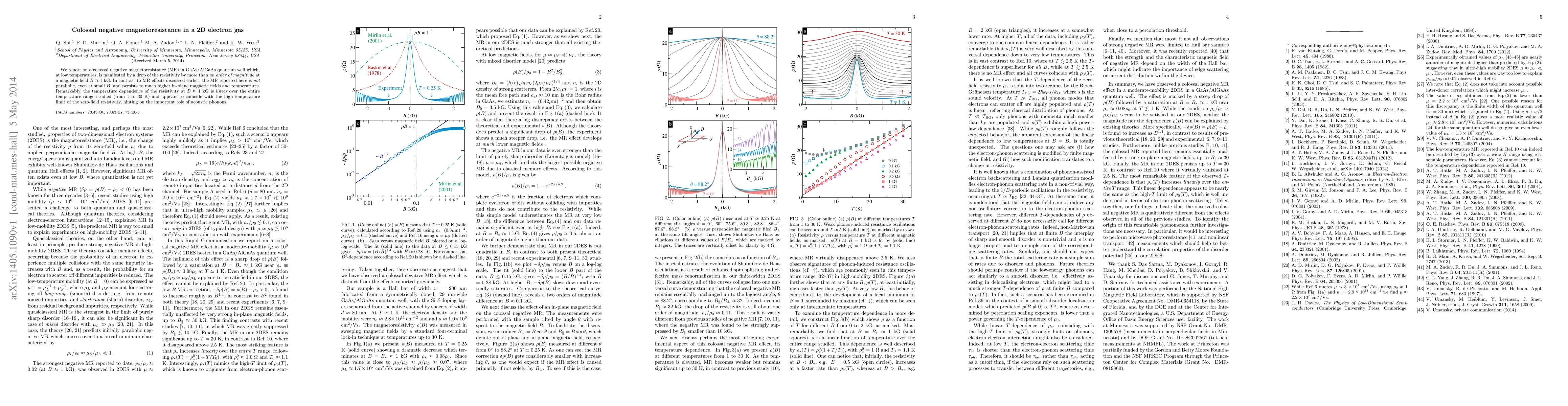 We report on a colossal negative magnetoresistance (MR) in GaAs/AlGaAs quantum well which, at low temperatures, is manifested by a drop of the resistivity by more than an order of magnitude at a magnetic field $B \approx 1$ kG. In contrast to MR effects discussed earlier, the MR reported here is not parabolic, even at small $B$, and persists to much higher in-plane magnetic fields and temperatures. Remarkably, the temperature dependence of the resistivity at $B \approx 1$ kG is linear over the entire temperature range studied (from 1 to 30 K) and appears to coincide with the high-temperature limit of the zero-field resistivity, hinting on the important role of acoustic phonons.