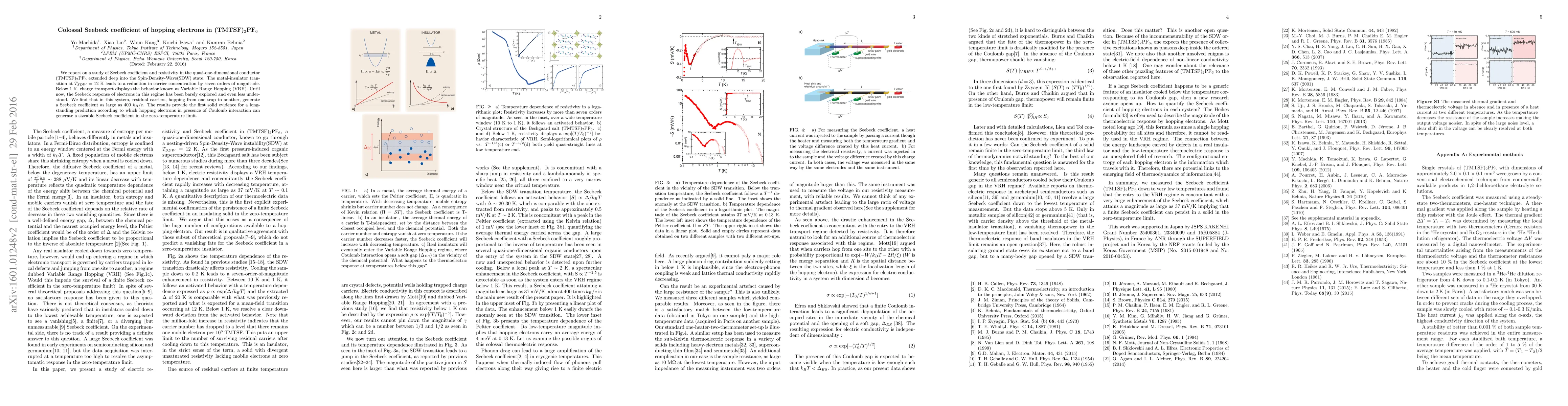 We report on a study of Seebeck coefficient and resistivity in the quasi-one-dimensional conductor (TMTSF)$_{2}$PF$_{6}$ extended deep into the Spin-Density-Wave(SDW) state. The metal-insulator transition at $T_{SDW}$ = 12 K leads to a reduction in carrier concentration by seven orders of magnitude. Below 1 K, charge transport displays the behavior known as Variable Range Hopping (VRH). Until now, the Seebeck response of electrons in this regime has been barely explored and even less understood. We find that in this system, residual carriers, hopping from one trap to another, generate a Seebeck coefficient as large as 400 $k_{B}$/$e$. The results provide the first solid evidence for a long-standing prediction according to which hopping electrons in presence of Coulomb interaction can generate a sizeable Seebeck coefficient in the zero-temperature limit.