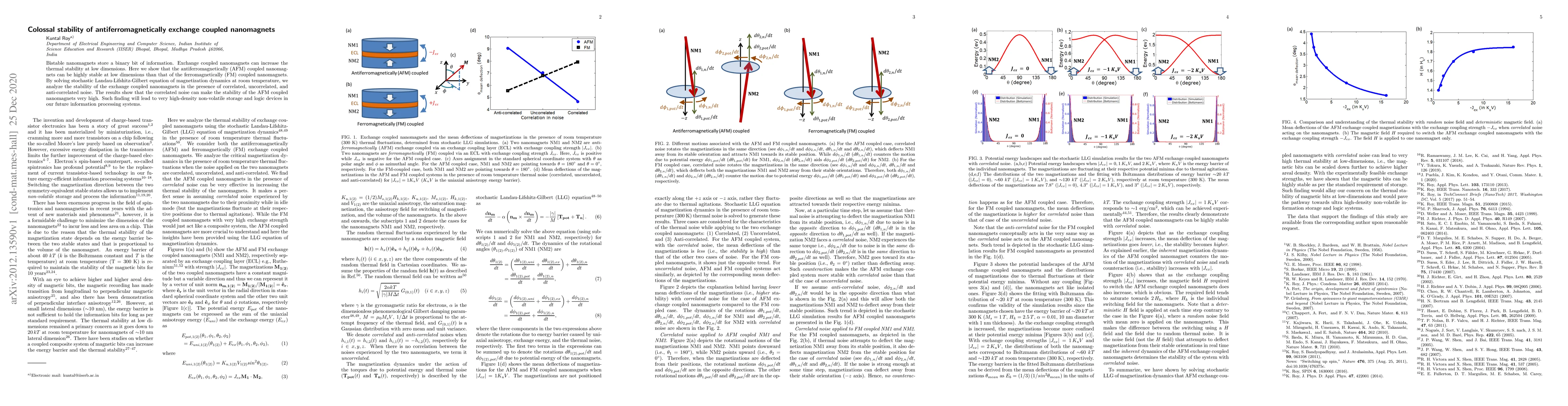 This paper demonstrates that antiferromagnetically coupled nanomagnets exhibit superior thermal stability compared to ferromagnetically coupled ones, even at low dimensions. The stability is further enhanced by correlated noise, which could enable high-density, non-volatile storage and logic devices for future information processing systems.