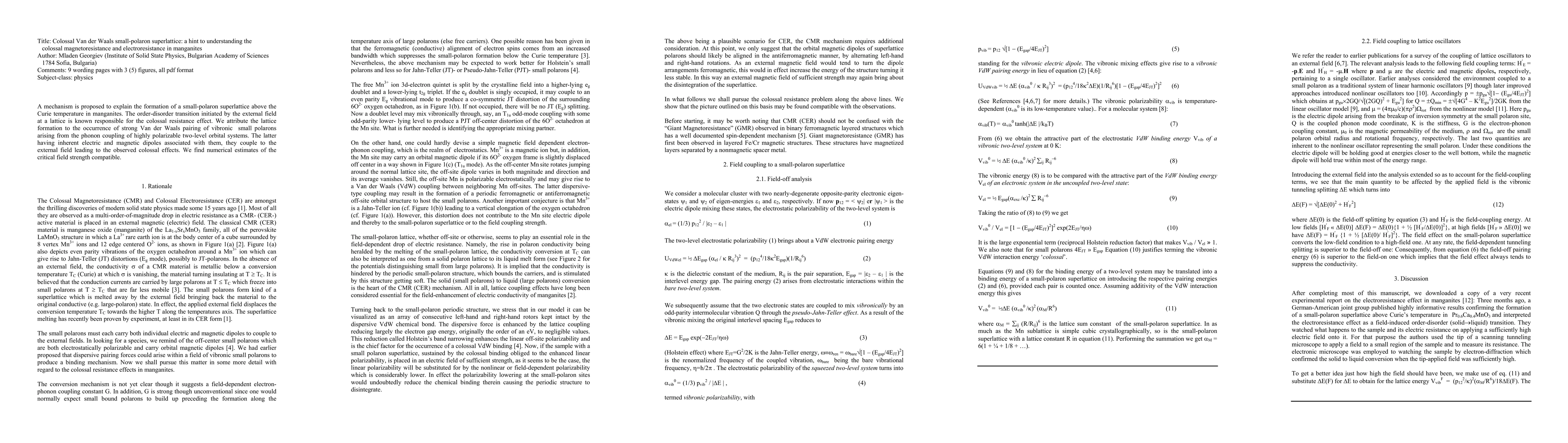 A mechanism is proposed to explain the formation of a small-polaron superlattice above the Curie temperature in manganites. The order-disorder transition initiated by the external field at a lattice is known responsible for the colossal resistance effect. We attribute the lattice formation to the occurrence of strong Van der Waals pairing of vibronic small polarons arising from the phonon coupling of highly polarizable two-level orbital systems. The latter having inherent electric and magnetic dipoles associated with them, they couple to the external field leading to the observed colossal effects. We find numerical estimates of the critical field compatible.