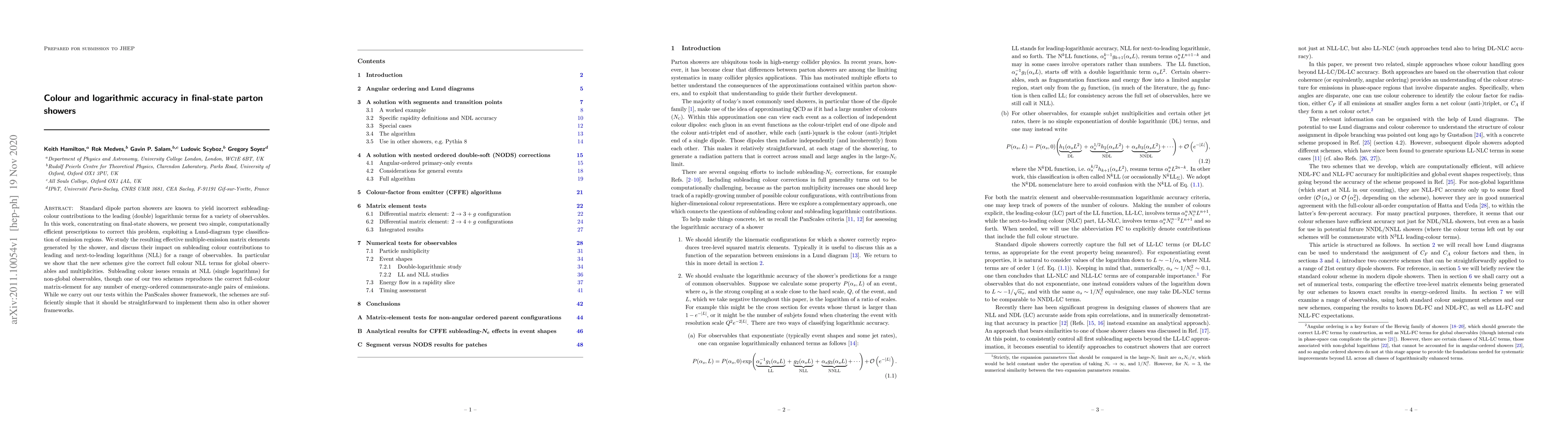 This paper proposes two efficient methods to correct subleading-colour inaccuracies in final-state parton showers, particularly addressing leading and next-to-leading logarithmic terms. The new schemes improve the accuracy for global observables and multiplicities, though some issues persist for non-global observables.