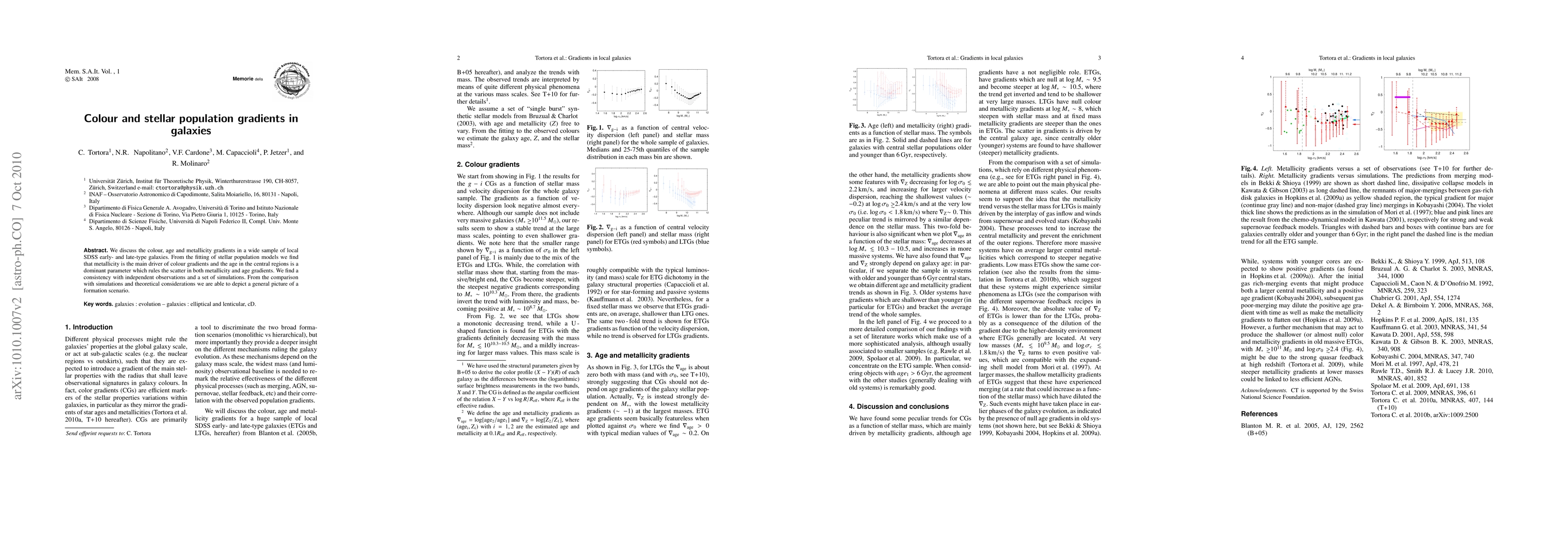 We discuss the colour, age and metallicity gradients in a wide sample of local SDSS early- and late-type galaxies. From the fitting of stellar population models we find that metallicity is the main driver of colour gradients and the age in the central regions is a dominant parameter which rules the scatter in both metallicity and age gradients. We find a consistency with independent observations and a set of simulations. From the comparison with simulations and theoretical considerations we are able to depict a general picture of a formation scenario.