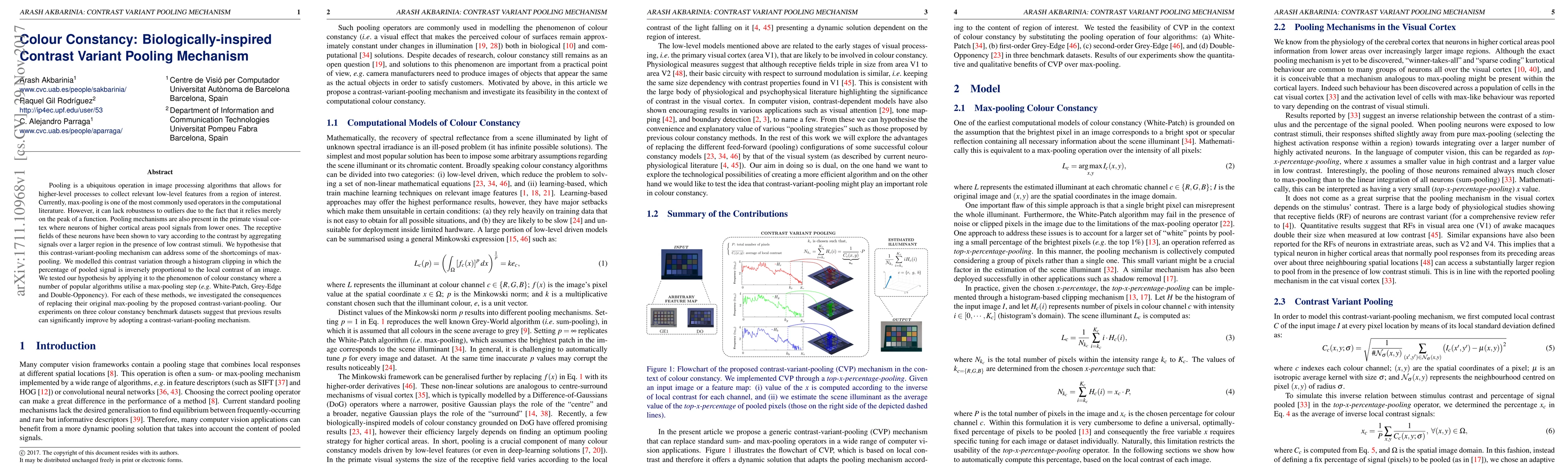 This paper proposes a biologically-inspired contrast-variant pooling mechanism to enhance colour constancy algorithms, replacing traditional max-pooling. The new method adjusts the pooled signal percentage inversely to local contrast, improving robustness and performance on colour constancy benchmarks.