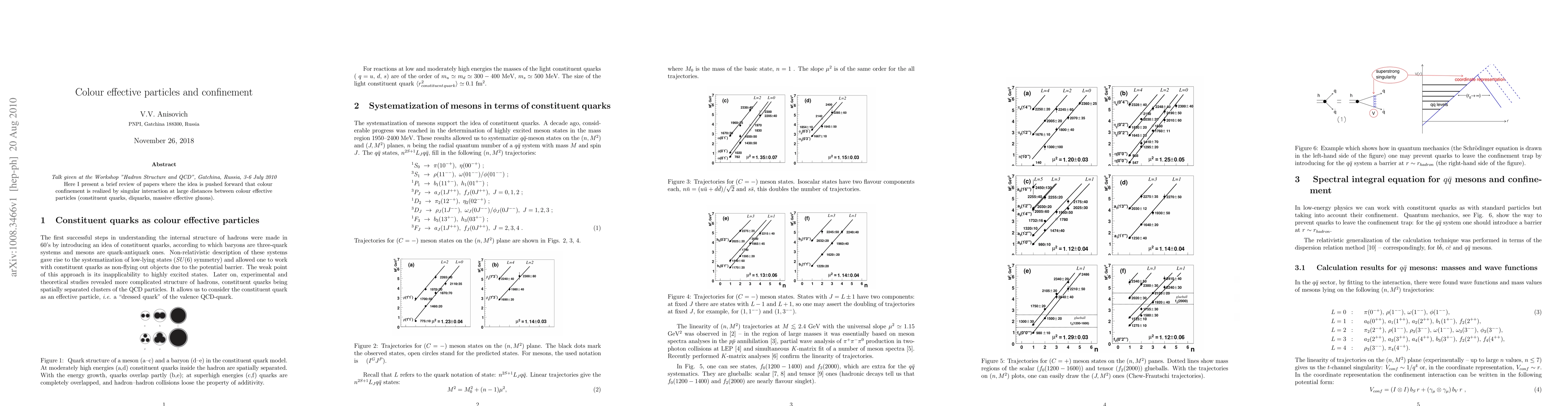Here I present a brief review of papers where the idea is pushed forward that colour confinement is realized by singular interaction at large distances between colour effective particles (constituent quarks, diquarks, massive effective gluons).