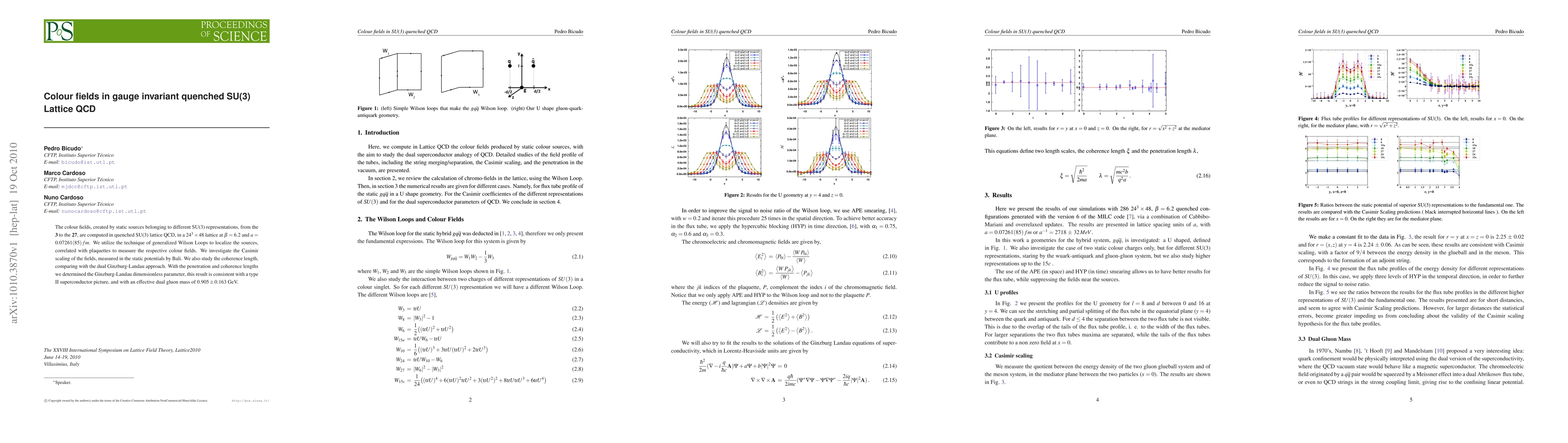 he colour fields, created by static sources belonging to different SU(3) representations, from the 3 to the 27, are computed in quenched SU(3) lattice QCD, in a 24^3 x 48 lattice at beta=6.2 and a=0.07261(85) fm. We utilize the technique of generalized Wilson Loops to localize the sources, correlated with plaquettes to measure the respective colour fields. We investigate the Casimir scaling of the fields, measured in the static potentials by Bali. We also study the coherence length, comparing with the dual Ginzburg-Landau approach. With the penetration and coherence lengths we determined the Ginzburg-Landau dimensionless parameter, this result is consistent with a type II superconductor picture, and with an effective dual gluon mass of 0.905 +- 0.163 GeV.