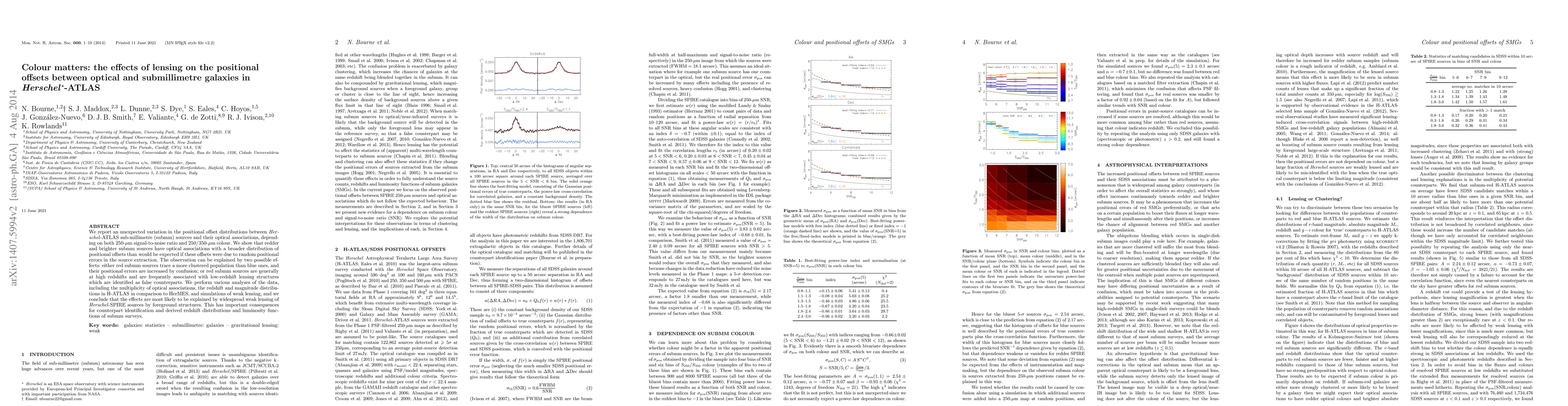 We report an unexpected variation in the positional offset distributions between Herschel-ATLAS sub-millimetre (submm) sources and their optical associations, depending on both 250-{\mu}m signal-to-noise ratio and 250/350-{\mu}m colour. We show that redder and brighter submm sources have optical associations with a broader distribution of positional offsets than would be expected if these offsets were due to random positional errors in the source extraction. The observation can be explained by two possible effects: either red submm sources trace a more clustered population than blue ones, and their positional errors are increased by confusion; or red submm sources are generally at high redshifts and are frequently associated with low-redshift lensing structures which are identified as false counterparts. We perform various analyses of the data, including the multiplicity of optical associations, the redshift and magnitude distributions in H-ATLAS in comparison to HerMES, and simulations of weak lensing, and we conclude that the effects are most likely to be explained by widespread weak lensing of Herschel-SPIRE sources by foreground structures. This has important consequences for counterpart identification and derived redshift distributions and luminosity functions of submm surveys.