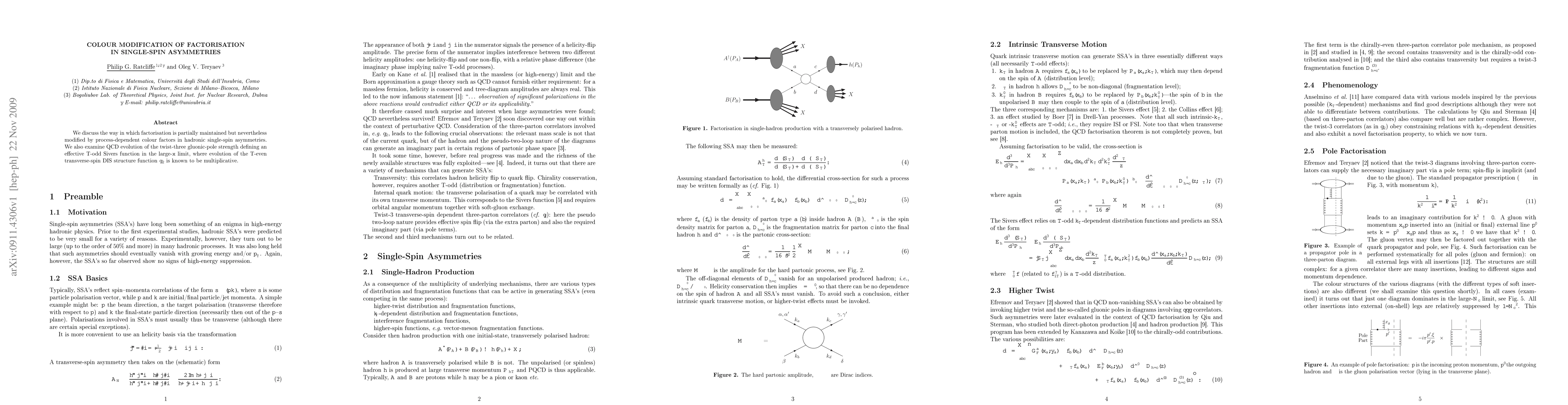 We discuss the way in which factorisation is partially maintained but nevertheless modified by process-dependent colour factors in hadronic single-spin asymmetries. We also examine QCD evolution of the twist-three gluonic-pole strength defining an effective T-odd Sivers function in the large-x limit, where evolution of the T-even transverse-spin DIS structure function g2 is known to be multiplicative.