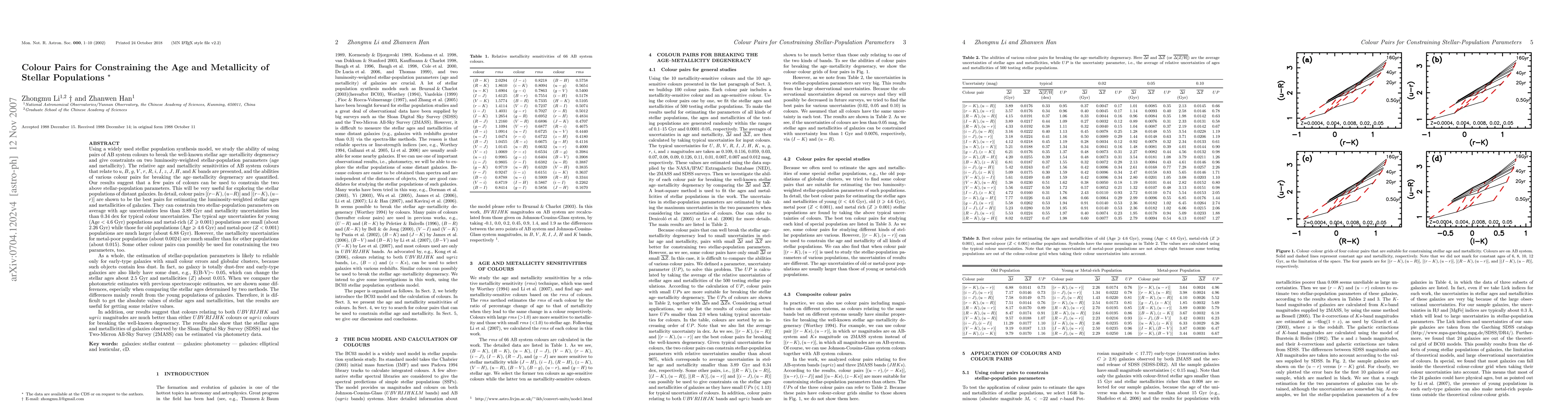 This paper investigates the use of colour pairs from the AB system to break the age-metallicity degeneracy in stellar populations, using a synthesis model. The study finds that colour pairs like [(r-K), (u-R)] provide the best constraints on stellar age and metallicity, with uncertainties below 3.89 Gyr and 0.34 dex, respectively. The results suggest that combining UBVRIJHK and ugriz colours is more effective than using either set alone.