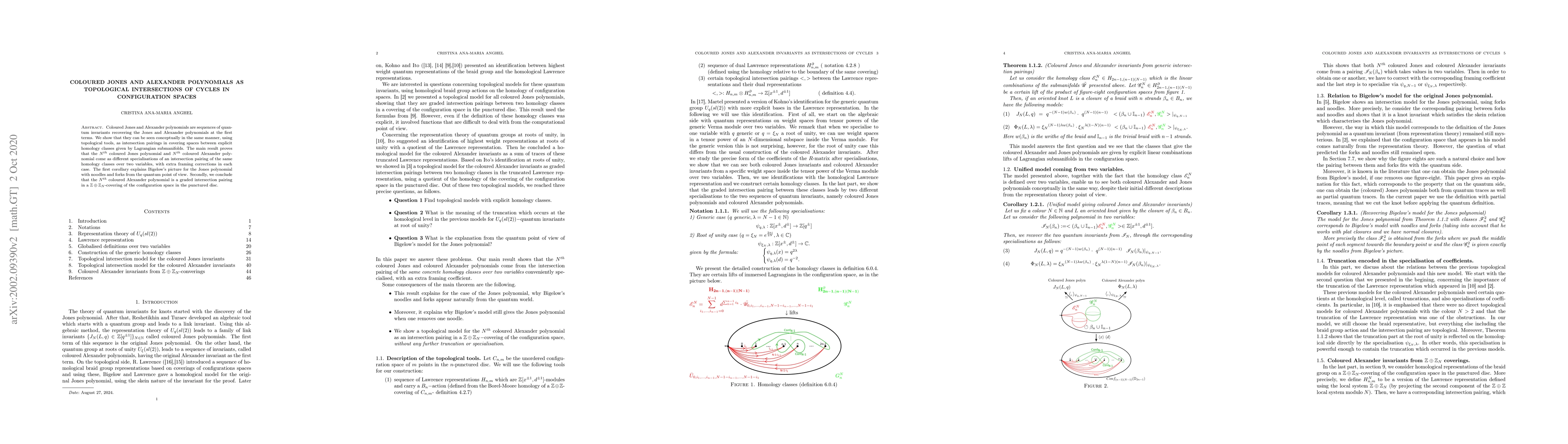 This paper establishes a conceptual equivalence between coloured Jones and Alexander polynomials through topological intersections in configuration spaces. It demonstrates that these polynomials arise from intersection pairings in covering spaces, linking them to homology classes defined by Lagrangian submanifolds.