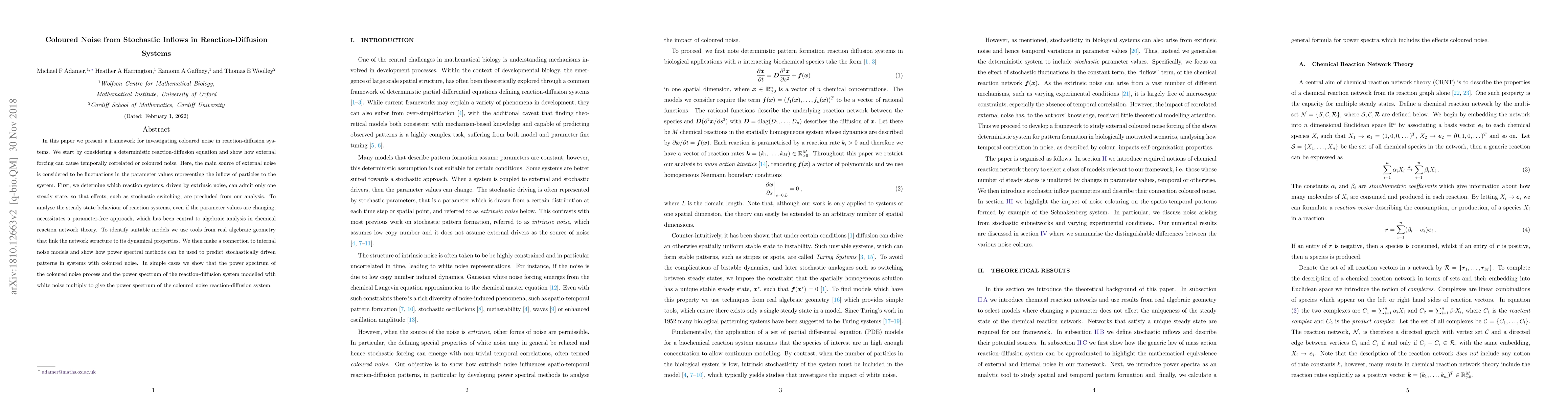 This paper develops a framework for studying coloured noise in reaction-diffusion systems driven by stochastic inflow fluctuations, using algebraic geometry to identify suitable models and power spectral methods to predict patterns, showing that coloured noise power spectra relate to those of white noise models.
