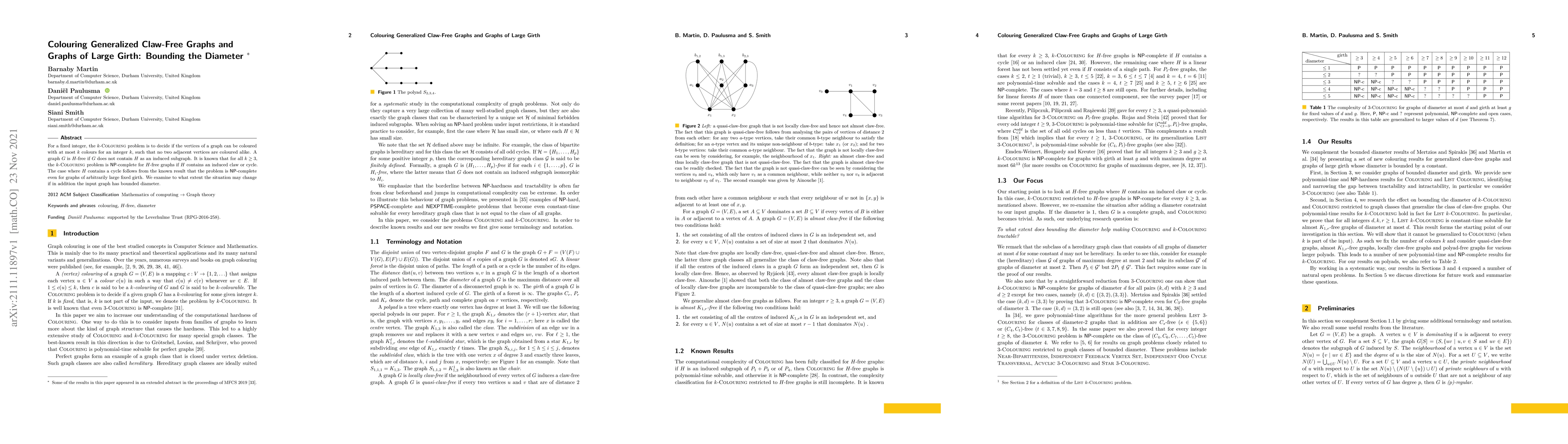 Researchers investigate how bounded diameter affects the NP-completeness of colouring generalized claw-free graphs and graphs of large girth, finding that the problem remains NP-complete even with a finite diameter.