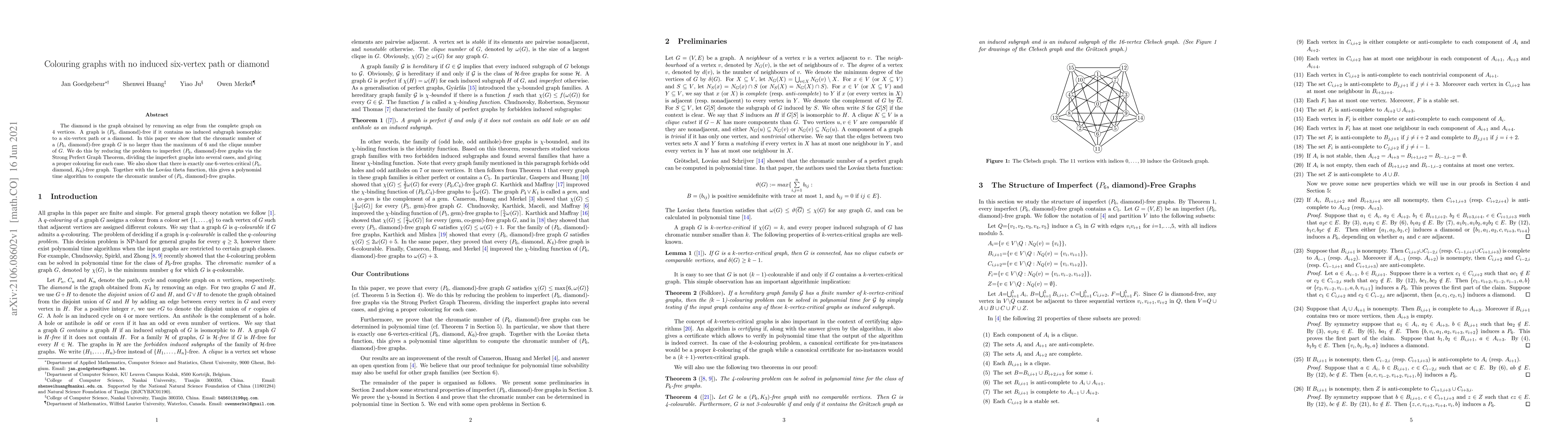 This paper establishes that the chromatic number of ($P_6$, diamond)-free graphs is at most 6 or the clique number of the graph, depending on the structure. It utilizes the Strong Perfect Graph Theorem to devise a polynomial-time algorithm for computing the chromatic number of such graphs.