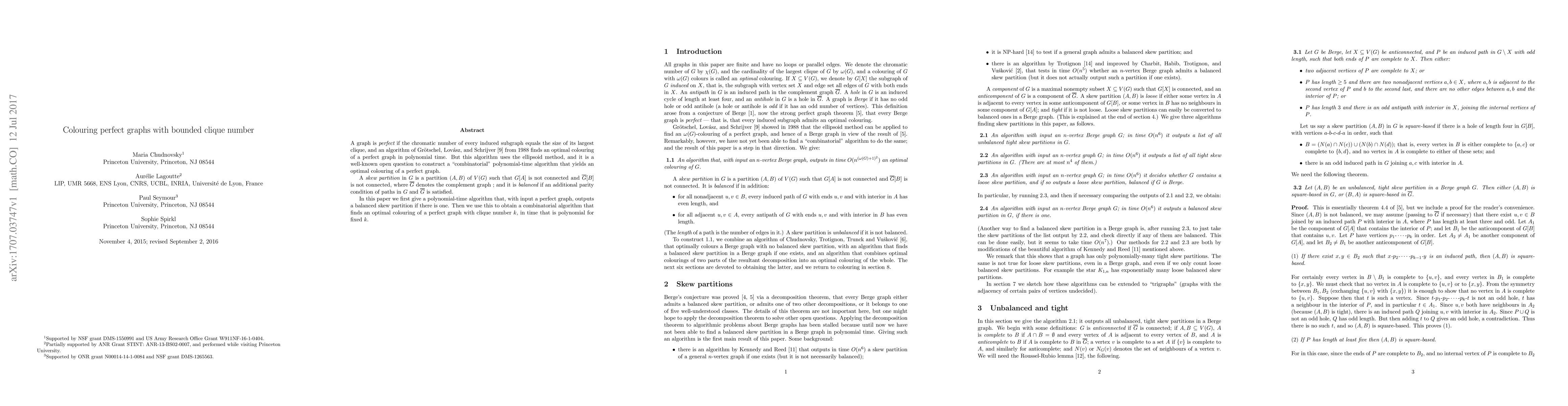 This paper presents a polynomial-time algorithm to find a balanced skew partition in perfect graphs, and uses this result to develop a combinatorial algorithm that optimally colours perfect graphs with a bounded clique number in polynomial time for fixed clique sizes.