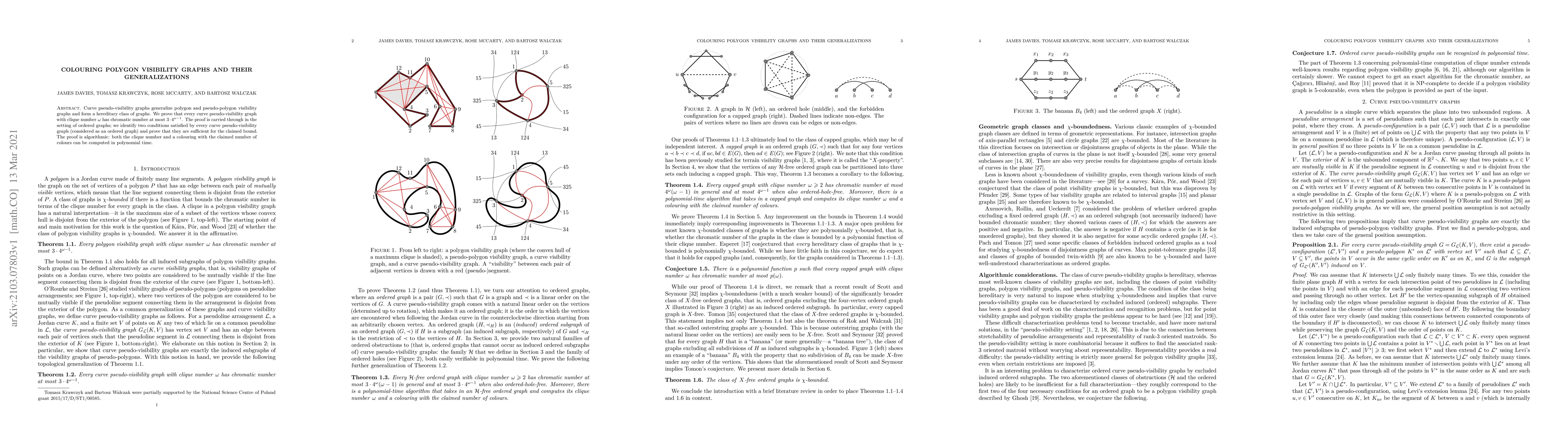 This paper proves that curve pseudo-visibility graphs, a generalization of polygon visibility graphs, have a chromatic number bounded by $3\cdot 4^{\omega-1}$, where $\omega$ is the clique number. The proof is algorithmic and applies to ordered graphs, demonstrating polynomial-time computability of both the clique number and the optimal colouring.