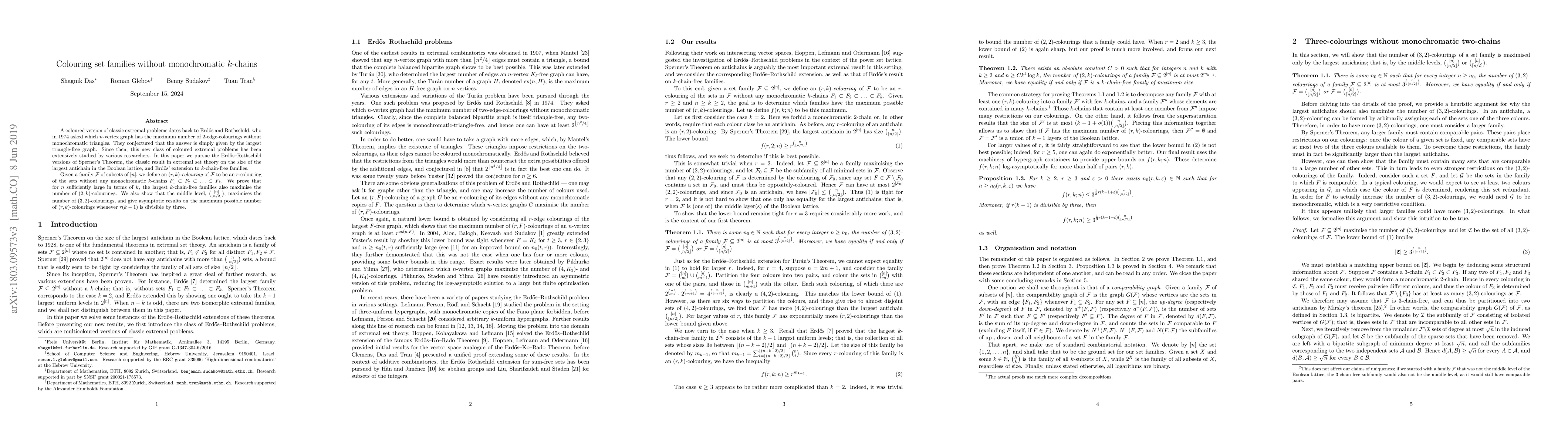A coloured version of classic extremal problems dates back to Erd\H{o}s and Rothschild, who in 1974 asked which $n$-vertex graph has the maximum number of 2-edge-colourings without monochromatic triangles. They conjectured that the answer is simply given by the largest triangle-free graph. Since then, this new class of coloured extremal problems has been extensively studied by various researchers. In this paper we pursue the Erd\H{o}s--Rothschild versions of Sperner's Theorem, the classic result in extremal set theory on the size of the largest antichain in the Boolean lattice, and Erd\H{o}s' extension to $k$-chain-free families. Given a family $\mathcal{F}$ of subsets of $[n]$, we define an $(r,k)$-colouring of $\mathcal{F}$ to be an $r$-colouring of the sets without any monochromatic $k$-chains $F_1 \subset F_2 \subset \dots \subset F_k$. We prove that for $n$ sufficiently large in terms of $k$, the largest $k$-chain-free families also maximise the number of $(2,k)$-colourings. We also show that the middle level, $\binom{[n]}{\lfloor n/2 \rfloor}$, maximises the number of $(3,2)$-colourings, and give asymptotic results on the maximum possible number of $(r,k)$-colourings whenever $r(k-1)$ is divisible by three.