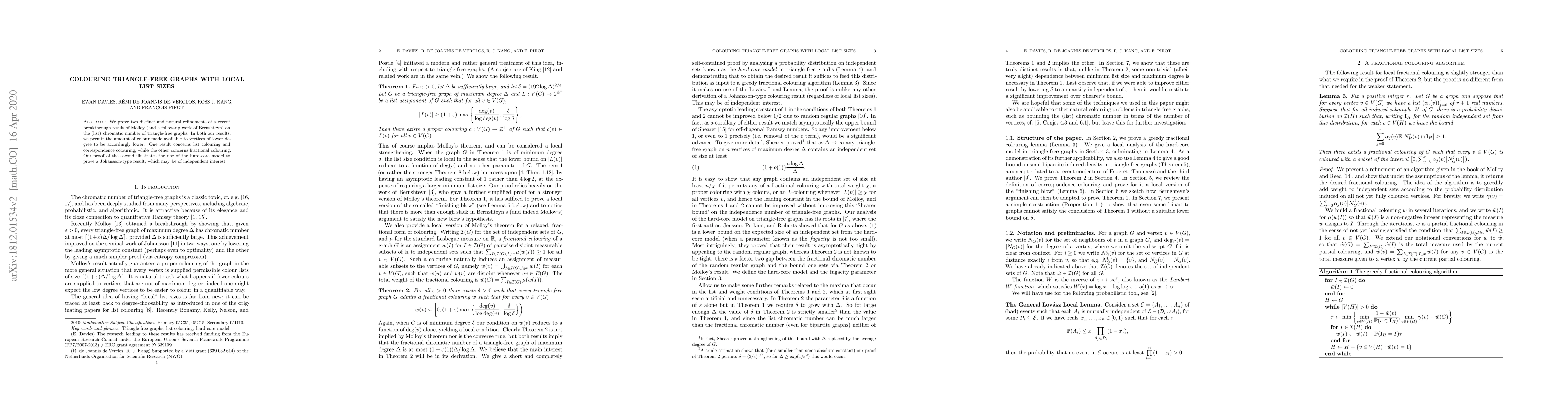 This paper refines Molloy's breakthrough on the list chromatic number of triangle-free graphs, allowing lower-degree vertices fewer colours. It presents results on list and correspondence colouring, and fractional colouring, using the hard-core model for a novel Johansson-type result.