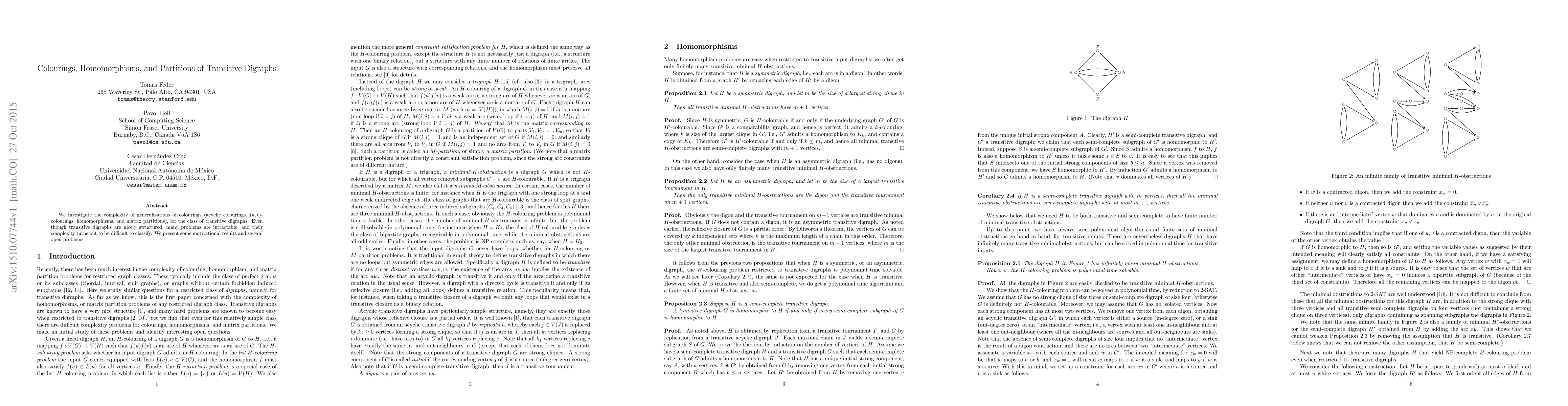 The research introduces new perspectives on the complexity classification of colourings, homomorphisms, and matrix partitions in the context of transitive digraphs, highlighting the intractability of many problems and presenting an infinite family of minimal obstructions.