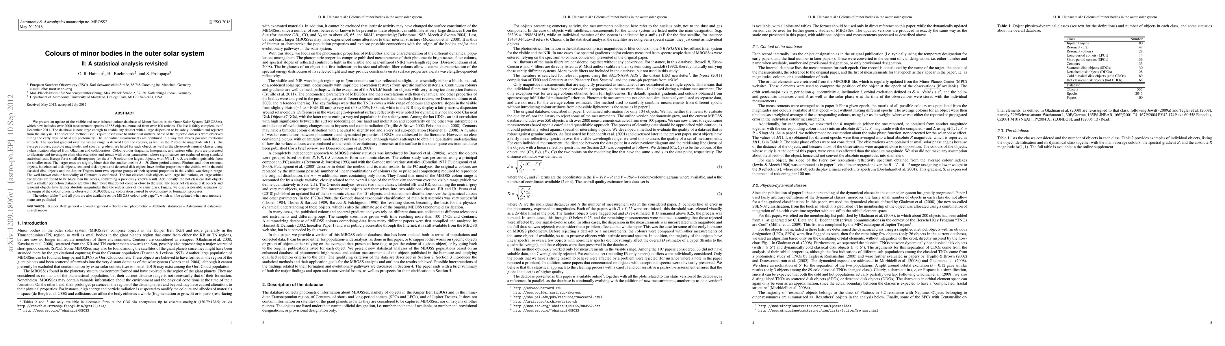 We present an update of the visible and near-infrared colour database of Minor Bodies in the Outer Solar System (MBOSSes), which now includes over 2000 measurement epochs of 555 objects, extracted from over 100 articles. The list is fairly complete as of December 2011. The database is now large enough to enable any dataset with a large dispersion to be safely identified and rejected from the analysis. The selection method used is quite insensitive to individual outliers. Most of the rejected datasets were observed during the early days of MBOSS photometry. The spectral gradient over the visible range is derived from the colours, as well as the R absolute magnitude M(1, 1). The average colours, absolute magnitude, and spectral gradient are listed for each object, as well as the physico-dynamical classes using a classification adapted from Gladman and collaborators. Colour-colour diagrams, histograms, and various other plots are presented to illustrate and investigate class characteristics and trends with other parameters, whose significances are evaluated using standard statistical tests. The colour tables and all plots are also available on the MBOSS colour web page http://www.eso.org/~ohainaut/MBOSS which will be updated when new measurements are published.