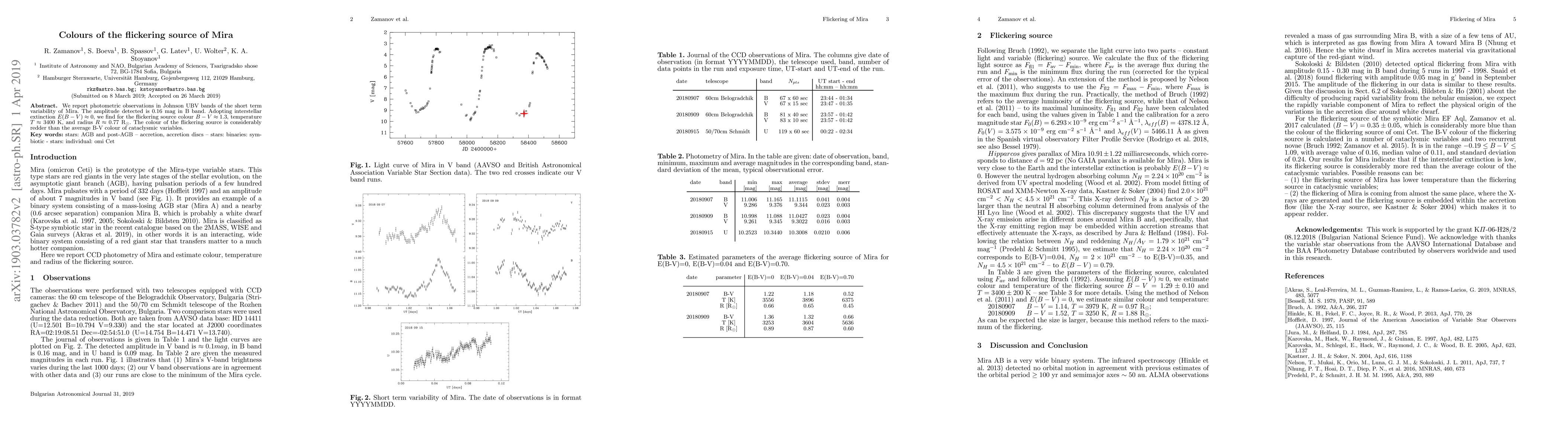 The study reports photometric observations of Mira's short-term variability in Johnson UBV bands, separating the light curve into constant and variable (flickering) components to estimate parameters of the flickering source.