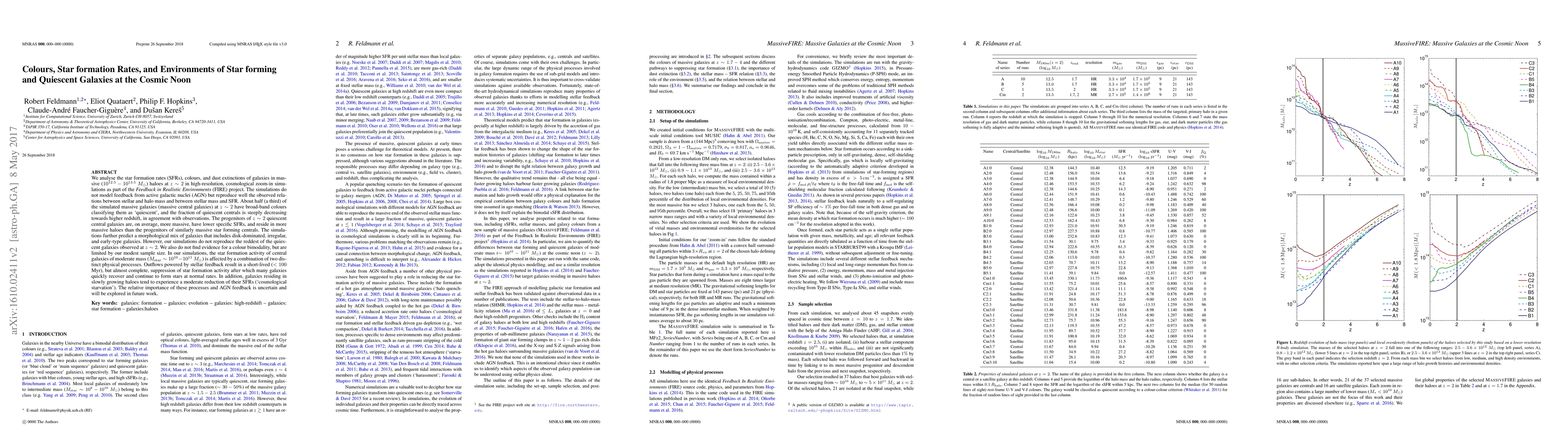 We analyse the star formation rates (SFRs), colours, and dust extinctions of galaxies in massive (10^12.5-10^13.5 Msun) haloes at z~2 in high-resolution, cosmological zoom-in simulations as part of the Feedback in Realistic Environments (FIRE) project. The simulations do not model feedback from active galactic nuclei (AGN) but reproduce well the observed relations between stellar and halo mass and between stellar mass and SFR. About half (a third) of the simulated massive galaxies (massive central galaxies) at z~2 have broad-band colours classifying them as 'quiescent', and the fraction of quiescent centrals is steeply decreasing towards higher redshift, in agreement with observations. The progenitors of z~2 quiescent central galaxies are, on average, more massive, have lower specific SFRs, and reside in more massive haloes than the progenitors of similarly massive star forming centrals. The simulations further predict a morphological mix of galaxies that includes disk-dominated, irregular, and early-type galaxies. However, our simulations do not reproduce the reddest of the quiescent galaxies observed at z~2. We also do not find evidence for a colour bimodality, but are limited by our modest sample size. In our simulations, the star formation activity of central galaxies of moderate mass (Mstar~10^10-10^11 Msun) is affected by a combination of two distinct physical processes. Outflows powered by stellar feedback result in a short-lived (<100 Myr), but almost complete, suppression of star formation activity after which many galaxies quickly recover and continue to form stars at normal rates. In addition, galaxies residing in slowly growing haloes tend to experience a moderate reduction of their SFRs ('cosmological starvation'). The relative importance of these processes and AGN feedback is uncertain and will be explored in future work.