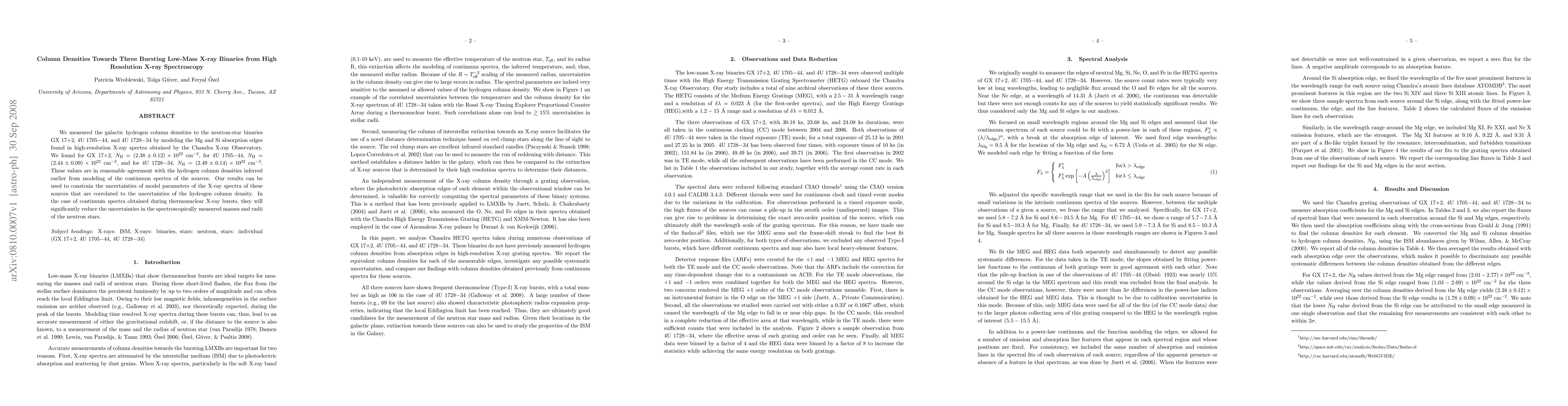 This paper measures the galactic hydrogen column densities towards three low-mass X-ray binaries using high-resolution X-ray spectra from the Chandra Observatory, finding values of (2.38 +/- 0.12) x 10^22 cm^-2, (2.44 +/- 0.09) x 10^22 cm^-2, and (2.49 +/- 0.14) x 10^22 cm^-2 respectively, which help to constrain model parameters and reduce uncertainties in neutron star masses and radii.