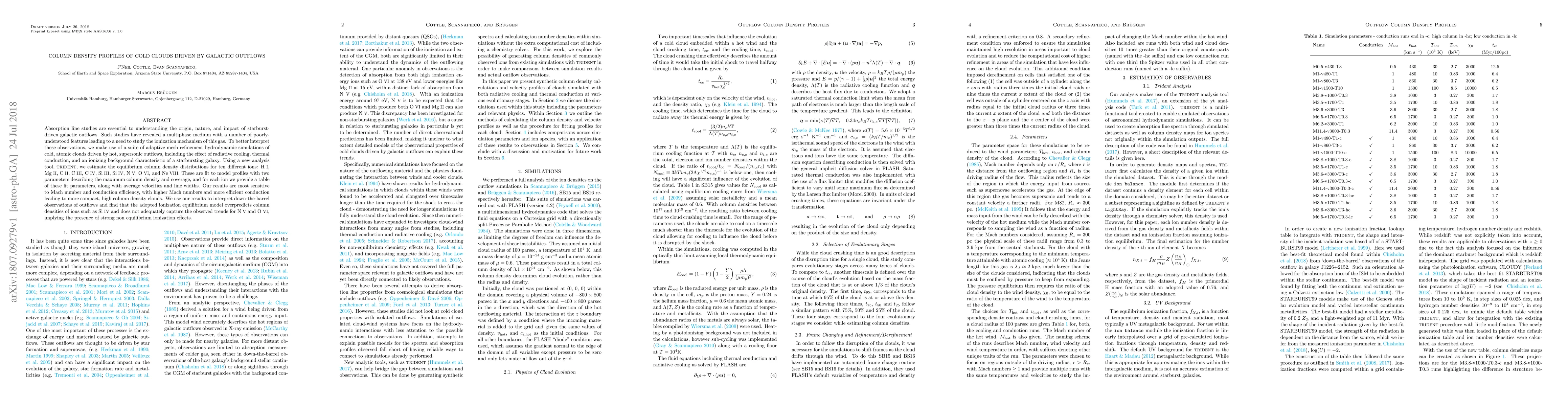 This paper uses hydrodynamic simulations to study the column density profiles of cold clouds influenced by starburst-driven galactic outflows, revealing complex multiphase gas dynamics. The analysis shows that higher outflow speeds and efficient thermal conduction result in denser clouds, but the models overpredict certain ion column densities, indicating significant non-equilibrium ionization effects.