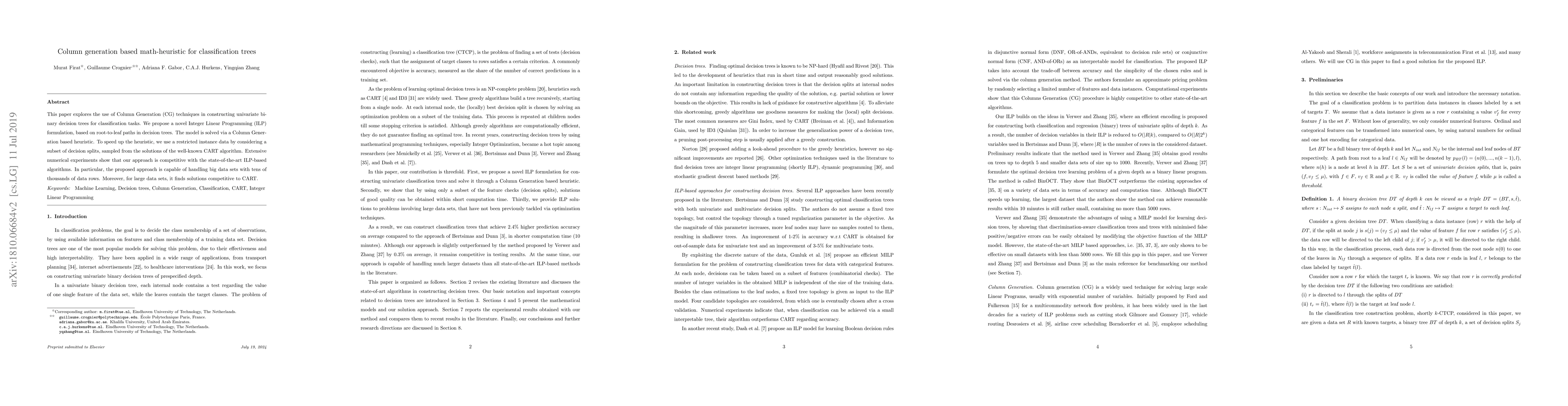 The paper introduces a novel ILP formulation for classification trees based on decision paths, along with a Column Generation heuristic to solve it efficiently.