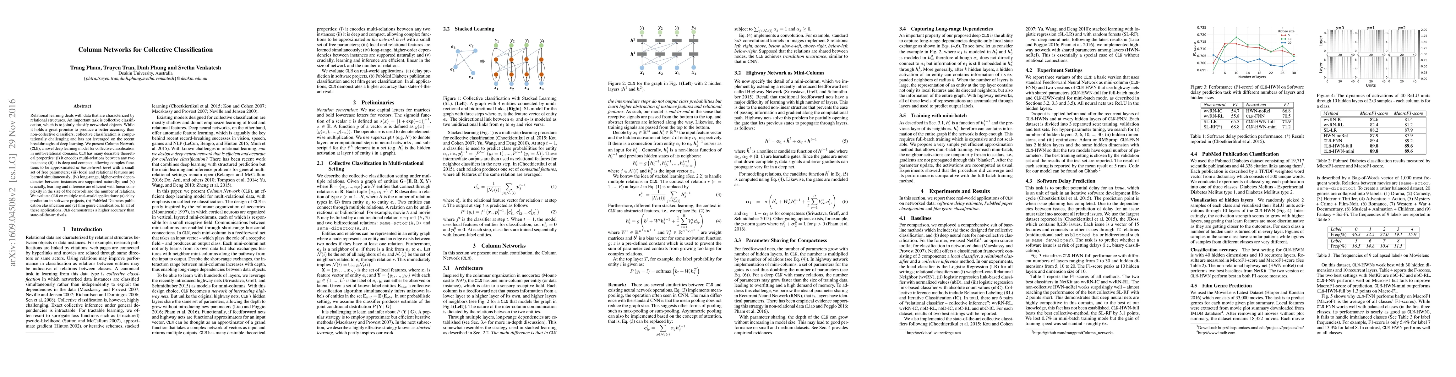 The paper introduces Column Networks (CLN), a novel deep learning model for collective classification in multi-relational domains, demonstrating higher accuracy than state-of-the-art methods in applications like delay prediction, PubMed classification, and film genre classification. CLN is efficient, compact, and supports complex relational features and higher-order dependencies.