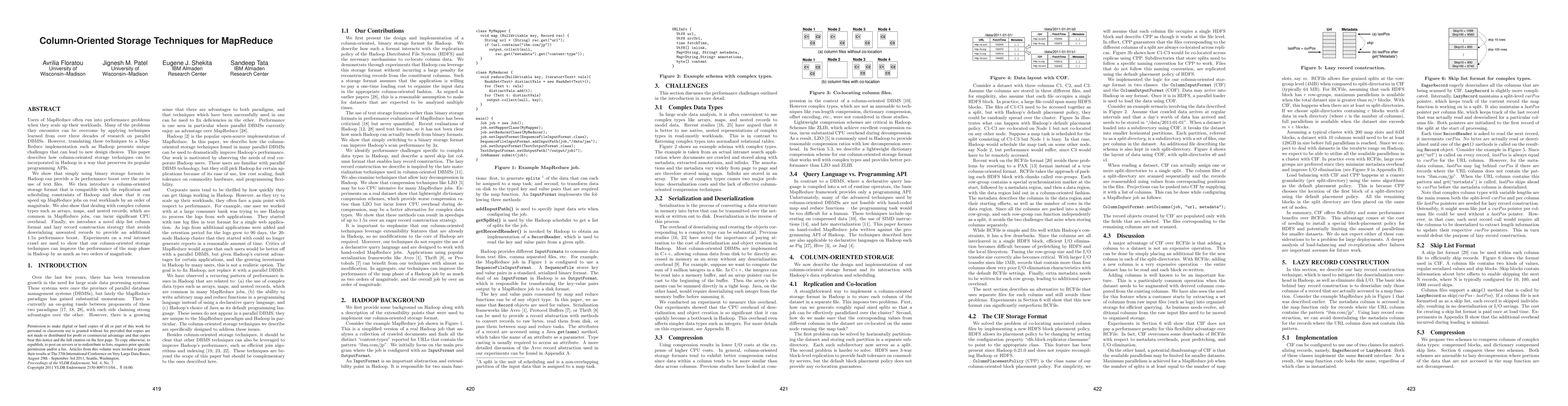 This paper explores the integration of column-oriented storage techniques into Hadoop's MapReduce framework to enhance performance. It demonstrates that adopting binary storage formats can triple performance compared to text files, and a novel column-oriented format can boost MapReduce job speeds by up to ten times, while also addressing complex data types.
