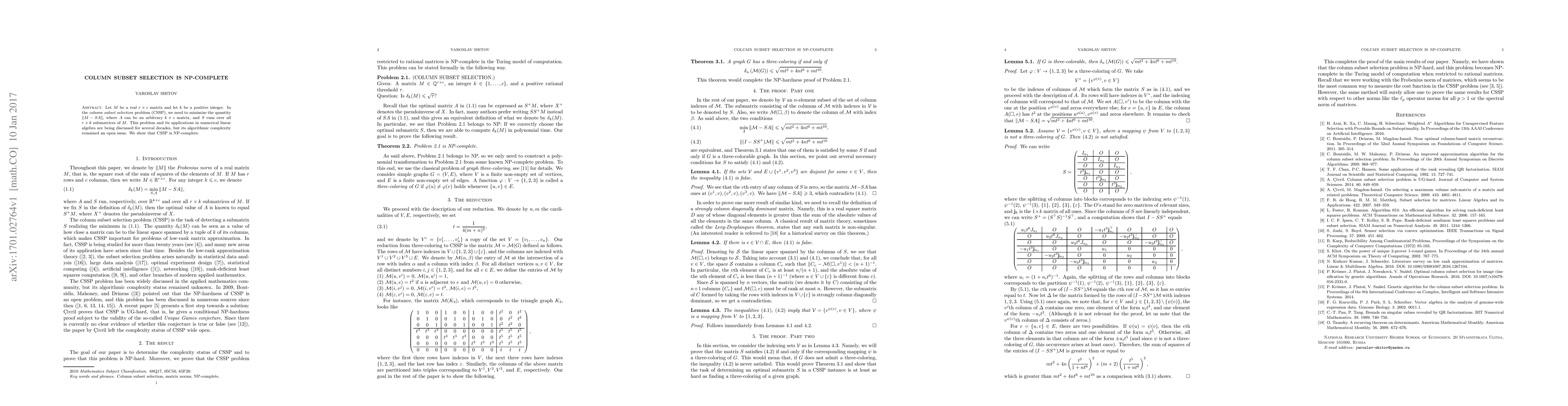 The column subset selection problem (CSSP) seeks to minimize the norm of the difference between a given matrix and a product of a selection of columns and an arbitrary matrix. This problem is shown to be NP-complete, indicating its computational complexity.